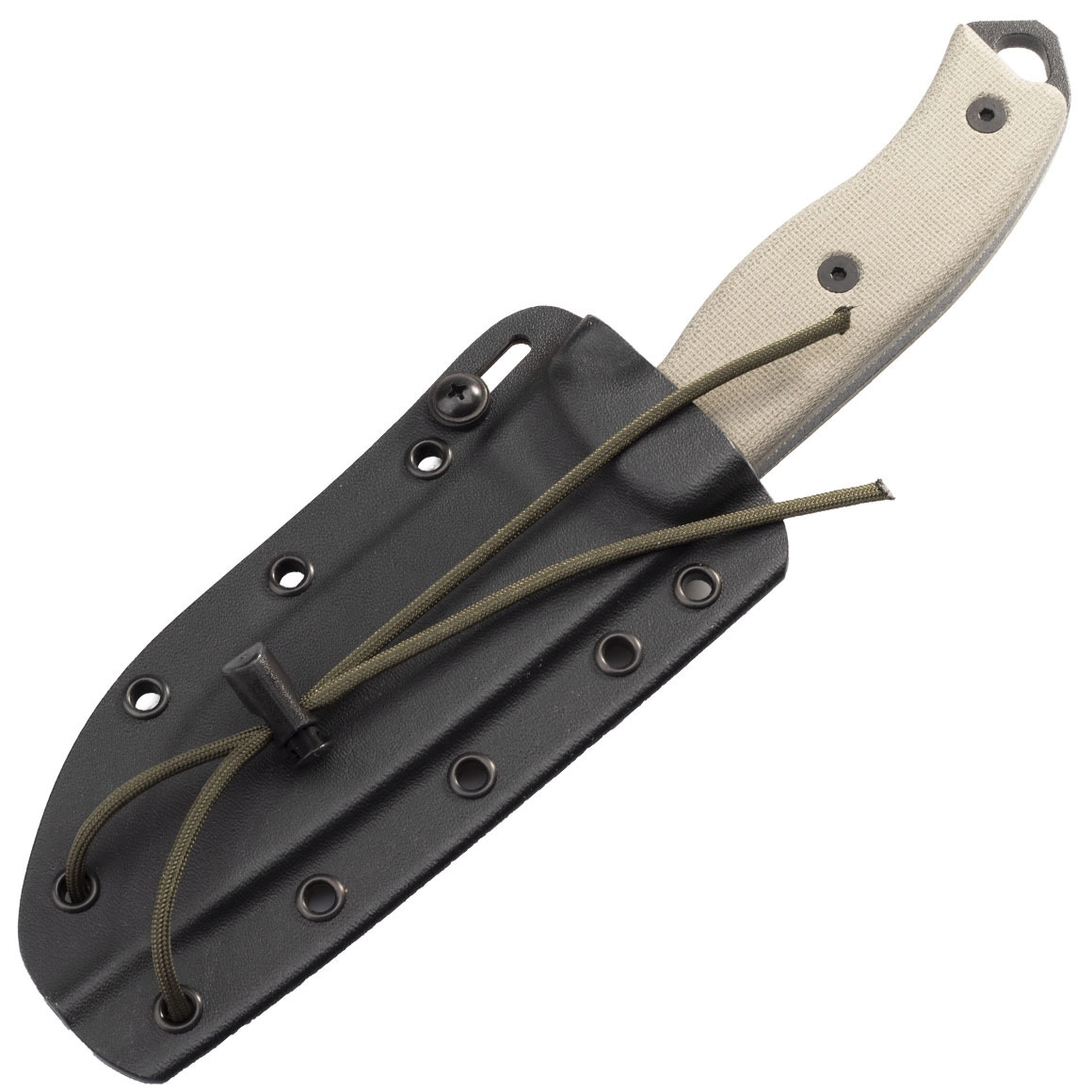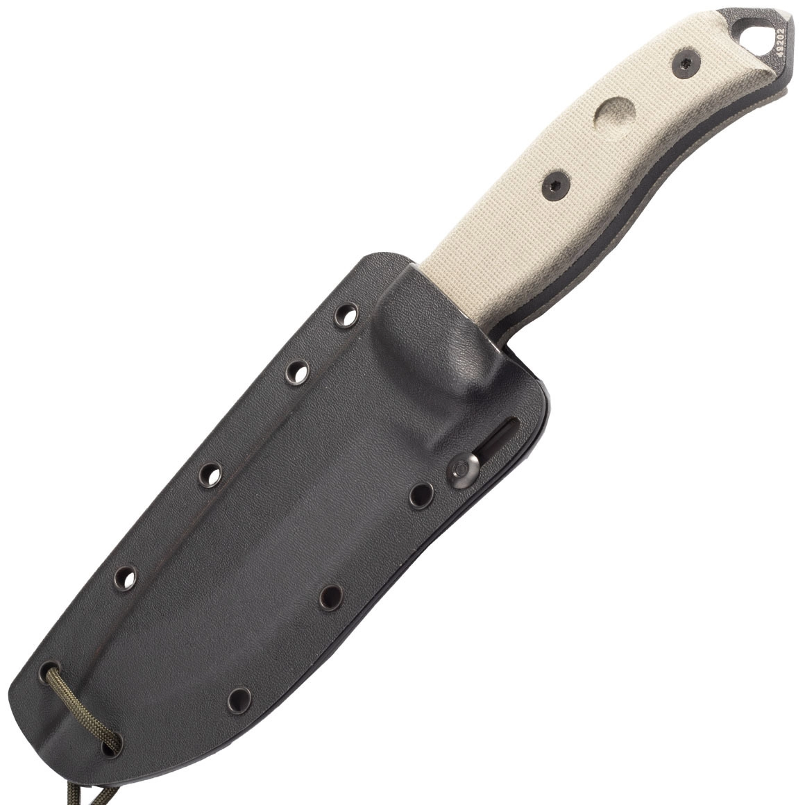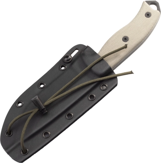De handgreep van canvas micarta is geschroefd, ligt zeker in de hand en biedt uitstekende grip, ook nat. Opvallende jimping voor de duim, een koordoog en een glashamer/slagpin aan het uiteinde ontbreken niet. Een bijzonder detail is het geïntegreerde kommetje voor bow‑drill om vuur te maken. Het mes wordt geleverd met een duurzame Kydex schede met meerdere doorgangen voor variabele draagopties.