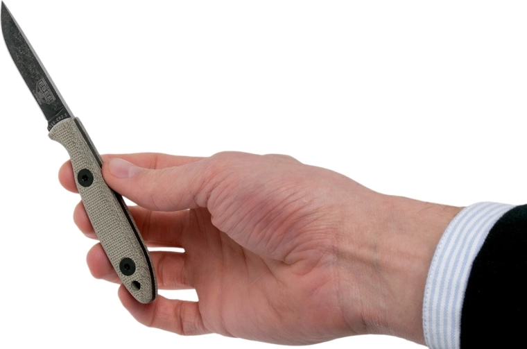 De getextureerde micarta in grijsgroene tint zorgt voor een comfortabele, stabiele en antislip grip, zelfs onder veeleisende omstandigheden.
