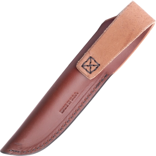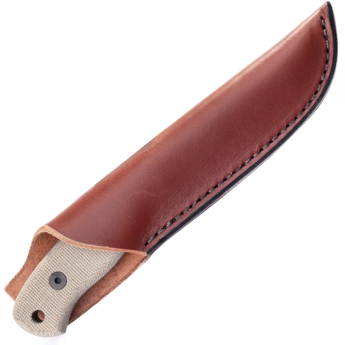 Getextureerde schalen van Micarta in de tint Tan zorgen voor een comfortabele, zekere greep, ook met handschoenen. De lederen schede met riemlus maakt veilig en stijlvol dragen mogelijk, zowel in het veld als in de stad.