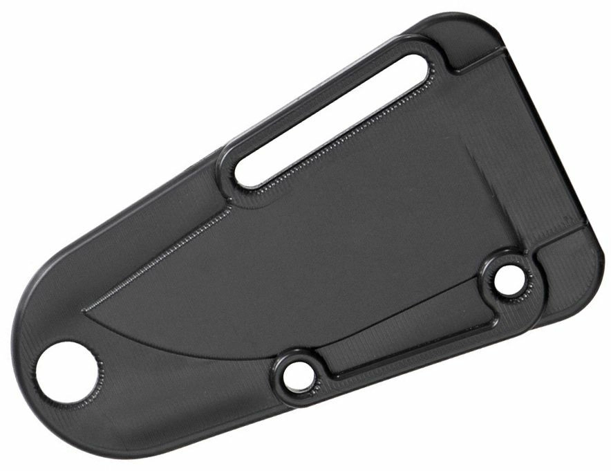 Lichtgewicht zwarte schede met meerdere montagegaten en sleuf voor flexibele bevestiging aan riem, banden of uitrusting.