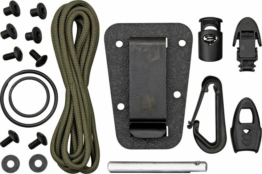 De set bevat paracord, koordstopper, splitringen, ferrostaafje, noodfluit, kunststof karabiner en montagehardware voor het aanpassen van de draagwijze.