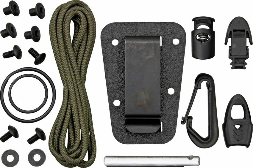 - Mes, kunststof schede, survivalkit (paracord, koordstopper, grote en kleine ring, firesteel, noodfluitje, kunststof karabiner)