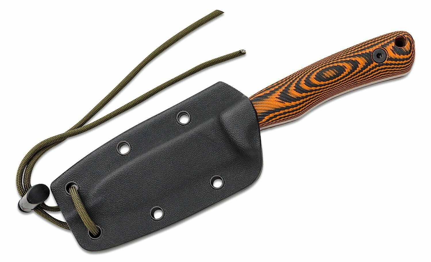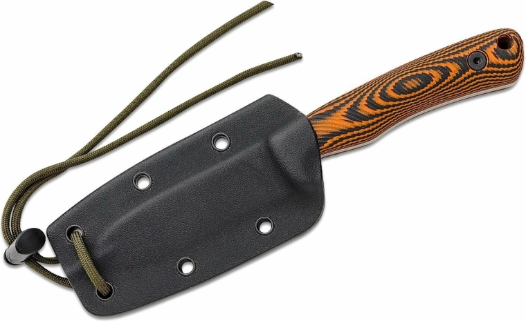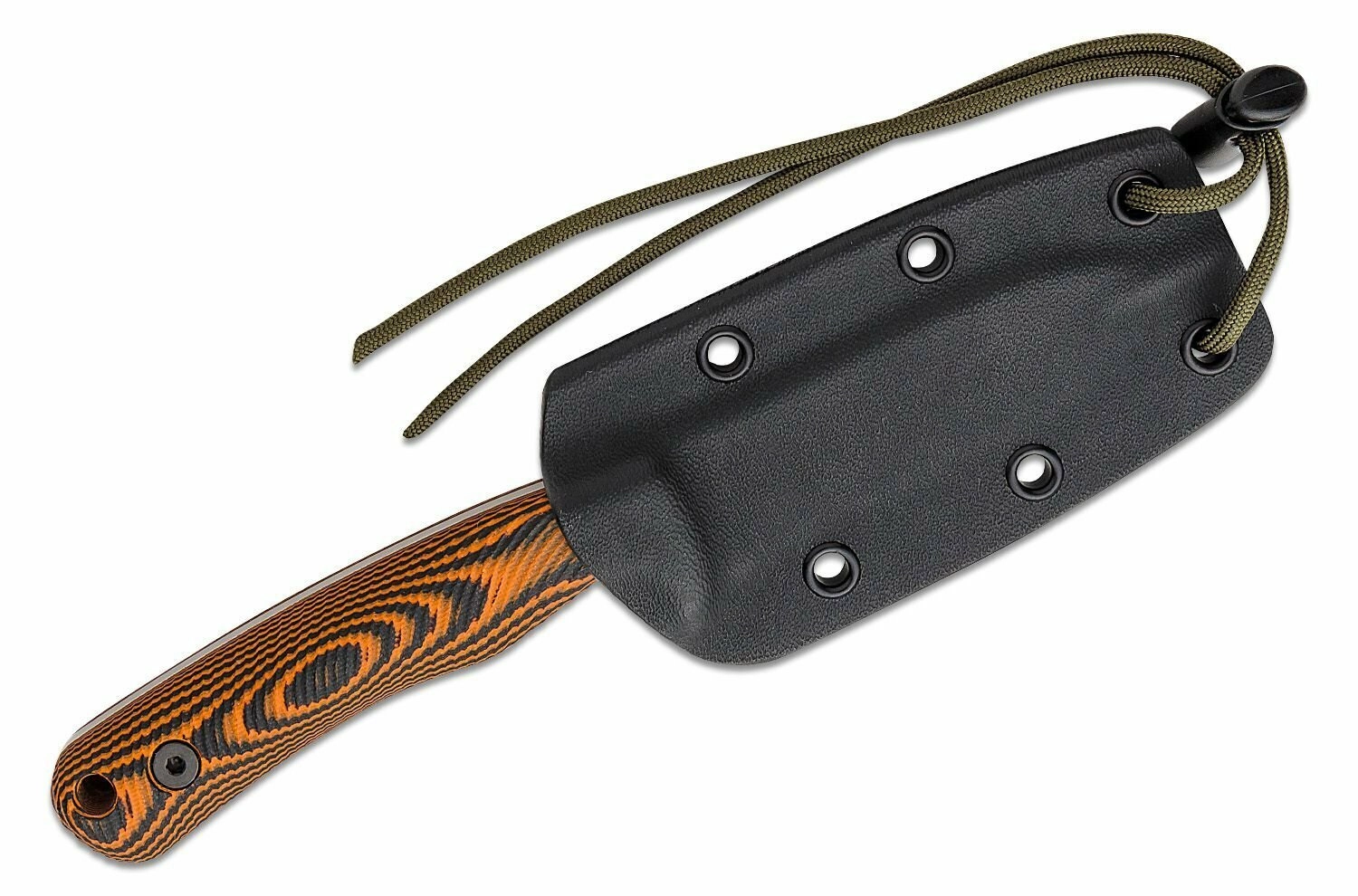 De full-tang constructie en de uitgesproken stootplaat beschermen de hand tegen wegglijden naar de snede. Getextureerde G10-schalen in zwart-oranje zorgen voor een zekere grip in natte en koude omstandigheden. Dankzij het koordoog kan het mes worden geborgd of eenvoudig uit de schede worden getrokken.