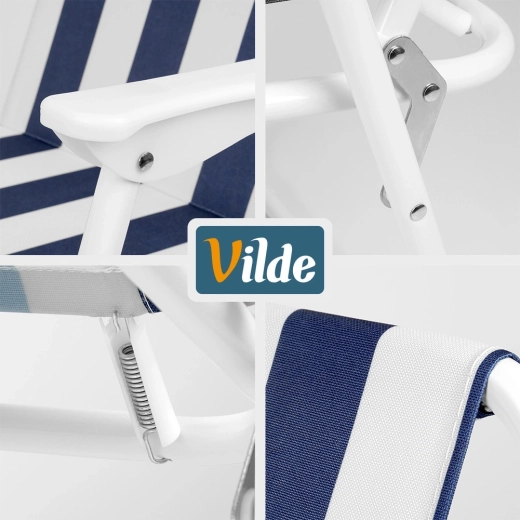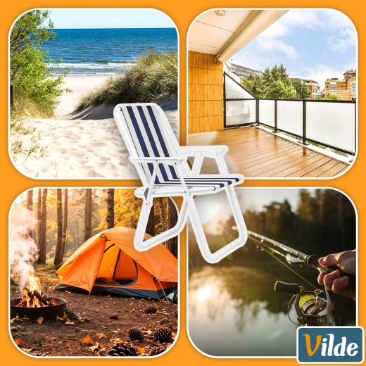 Deze opvouwbare toeristenstoel Vilde combineert duurzaamheid en comfort in een elegant design met blauw‑witte strepen. Het stabiele metalen frame in het wit en de sterke polyesterstof bieden betrouwbare ondersteuning, thuis en onderweg. Dankzij het lage gewicht en het snelle opvouwen neem je hem gemakkelijk mee naar het strand, vissen, picknick of camping.