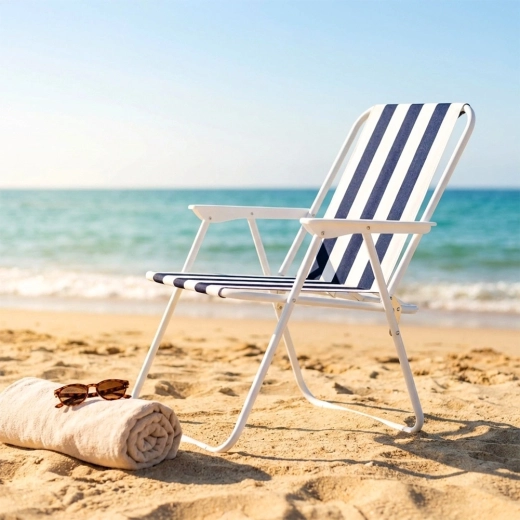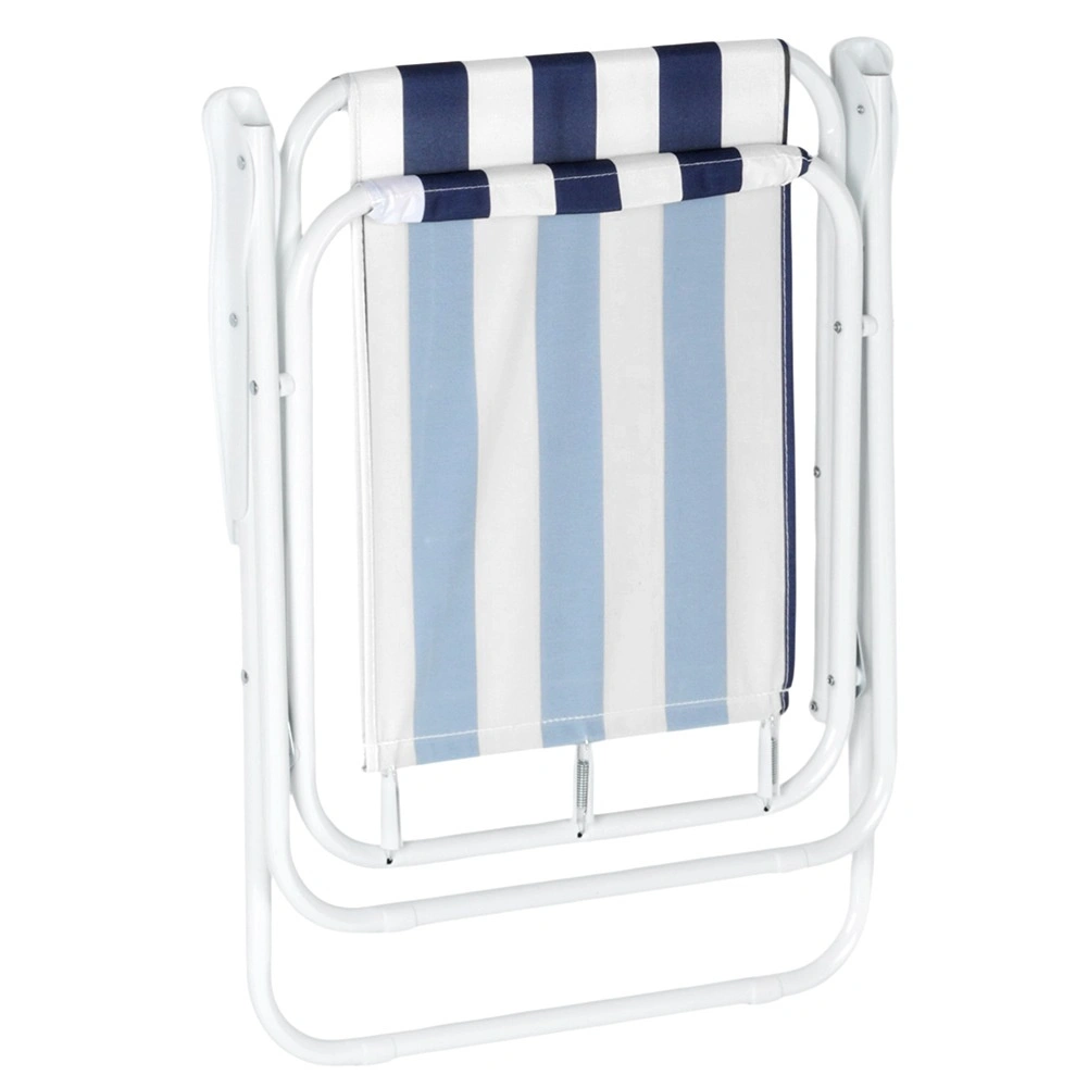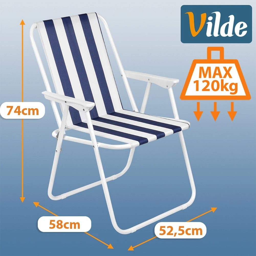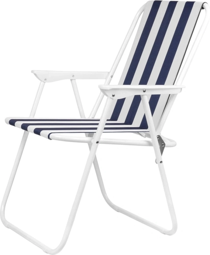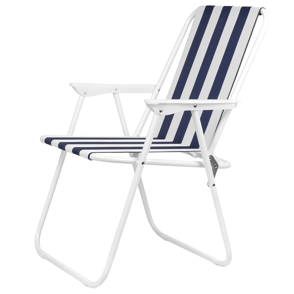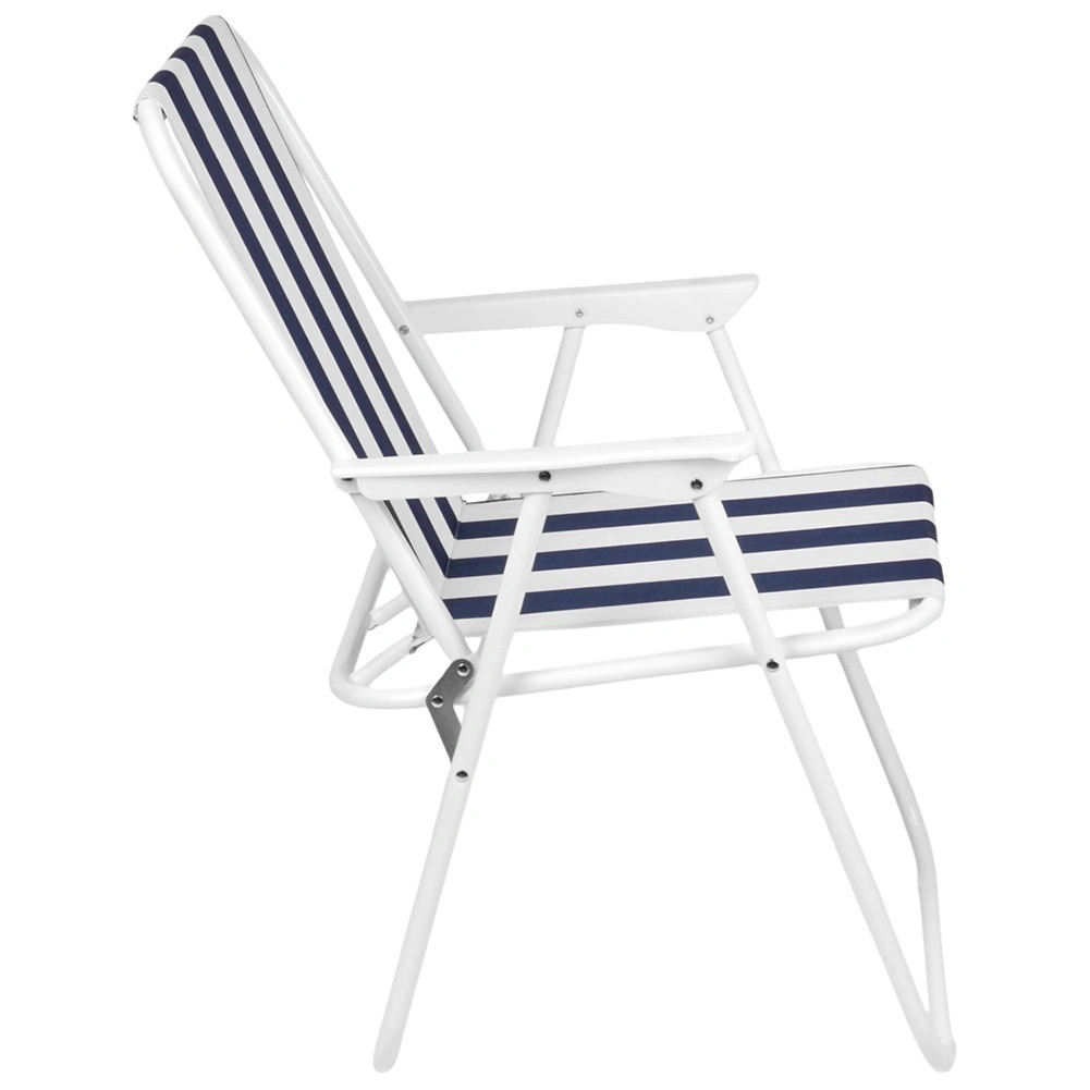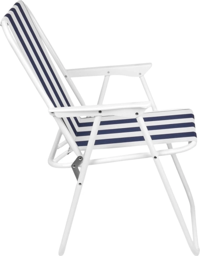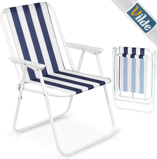 Lichte en draagbare opvouwbare stoel met maritieme strepen, ideaal voor strand, kamperen en tuin. Biedt een stevige metalen constructie, comfortabele armleuningen en compacte afmetingen na het opvouwen voor eenvoudig opbergen en transport. Draagvermogen 120 kg en duurzame polyesterstof zorgen voor een lange levensduur en veilig zitten.