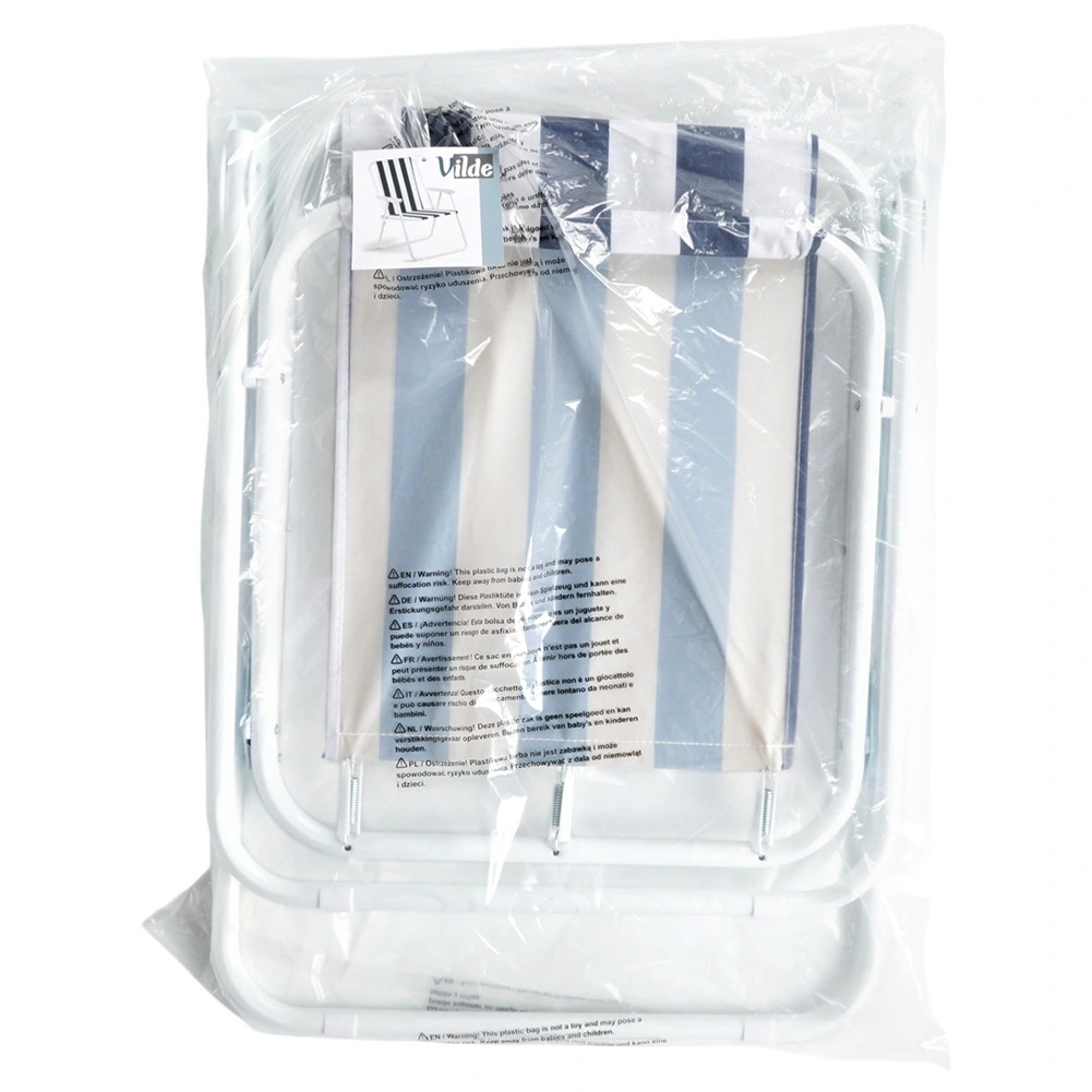 Het witte metalen frame en de sterke polyesterstof met maritieme strepen zorgen voor stabiliteit en een lange levensduur bij een draagvermogen tot 120 kg.