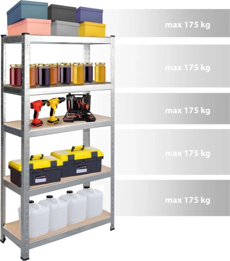 Tot 175 kg per plank en de mogelijkheid om te splitsen in twee kleinere stellingkasten of te gebruiken als werkbank. Ideaal voor garage, werkplaats of opslag.