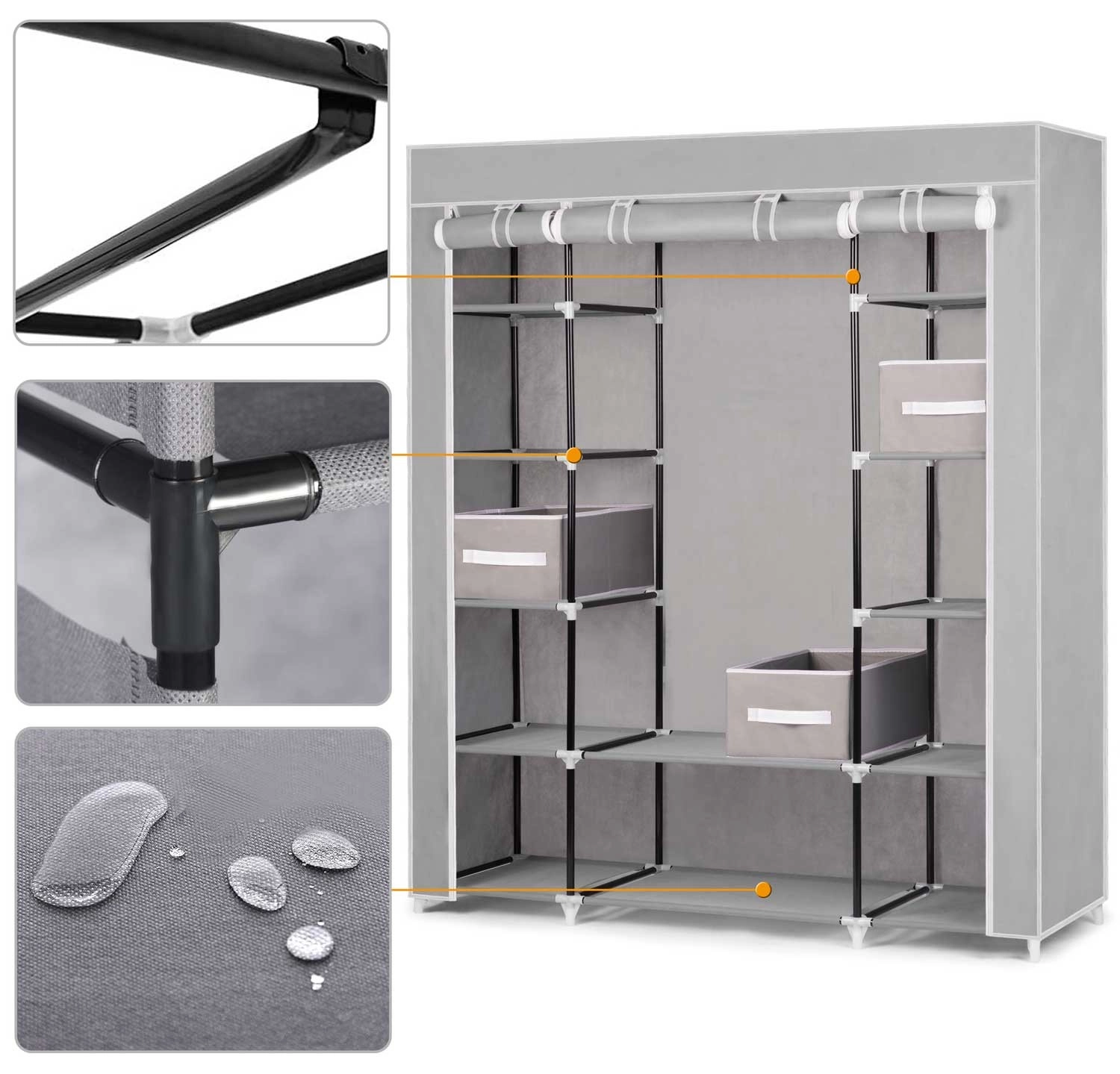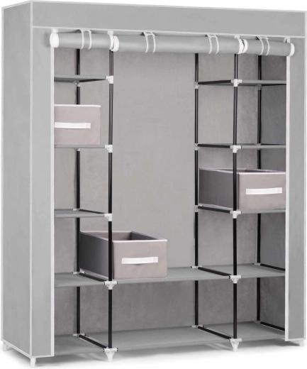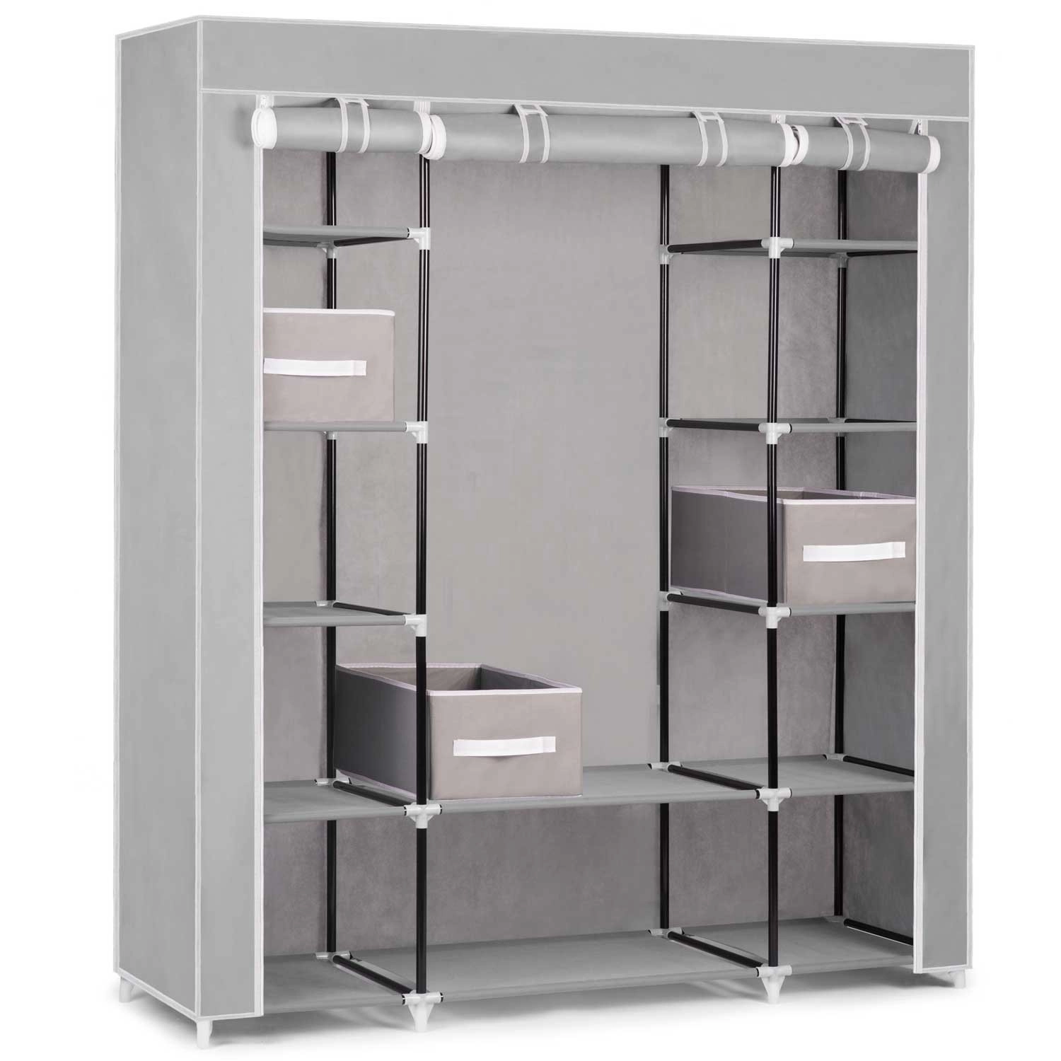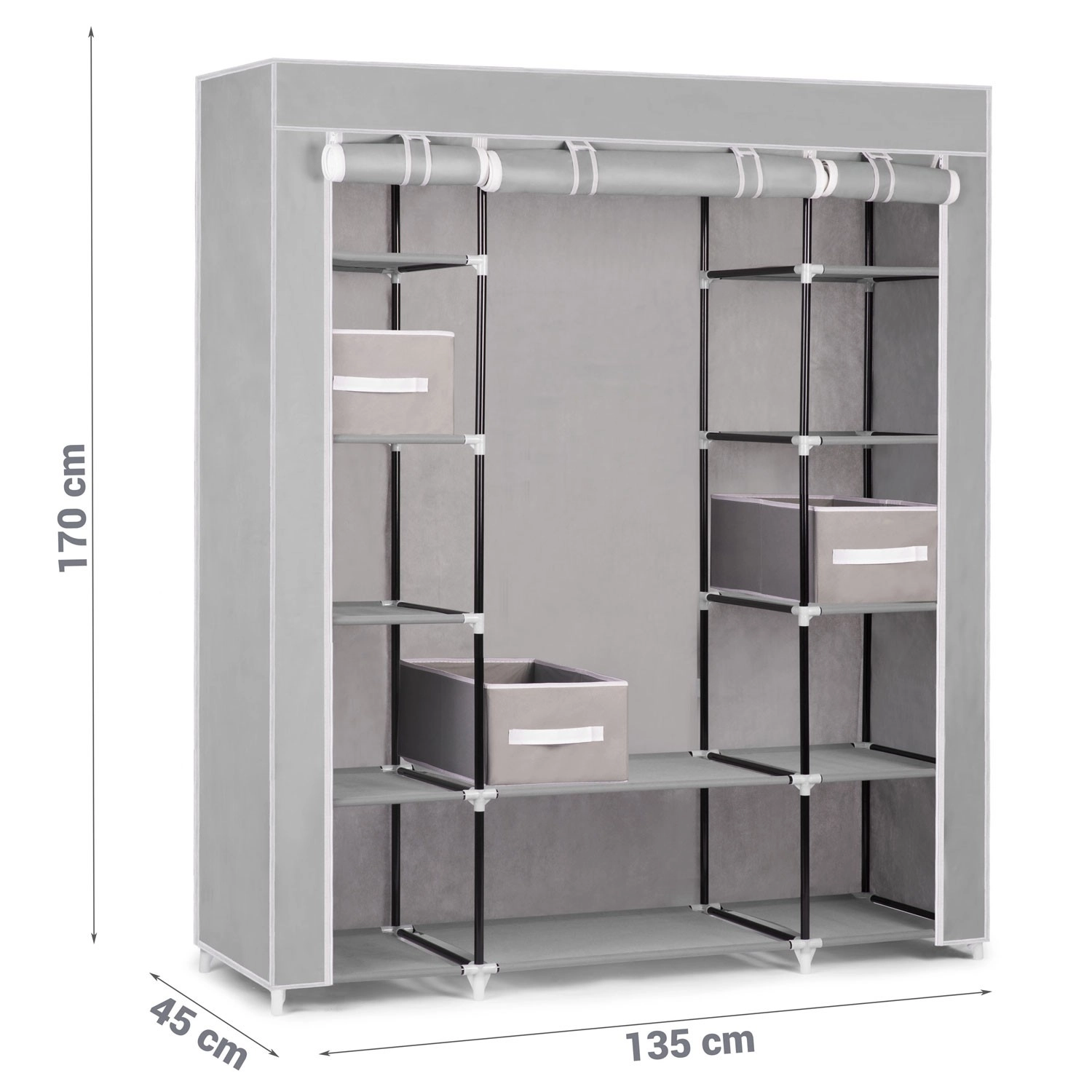 Praktische textielkast Massido in elegante grijze kleur met 12 stevige legplanken, 3 ruime lades en een kledingroede voor overzichtelijke opslag van kleding. De stabiliteit wordt gewaarborgd door een stalen frame met duurzame PP-verbindingen en waterafstotend materiaal. Drie onafhankelijke opbergzones met eigen deurtjes en vier ritsen maken dagelijks gebruik en snelle toegang eenvoudig.