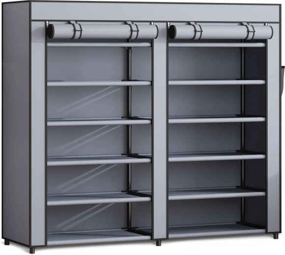 Praktische textiele schoenenkast Massido in elegante grafietkleur biedt tot 12 stevige legplanken, een stabiele stalen constructie en ritssluiting voor een nette en overzichtelijke toegang. Dankzij de waterafstotende hoes en de eenvoudige, intuïtieve montage is hij ideaal voor de hal, kleedkamer en kleinere appartementen.