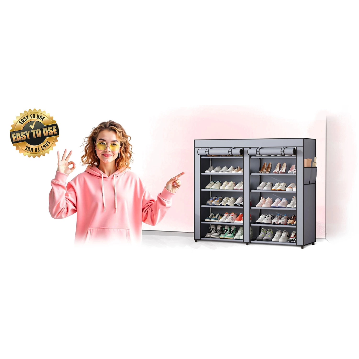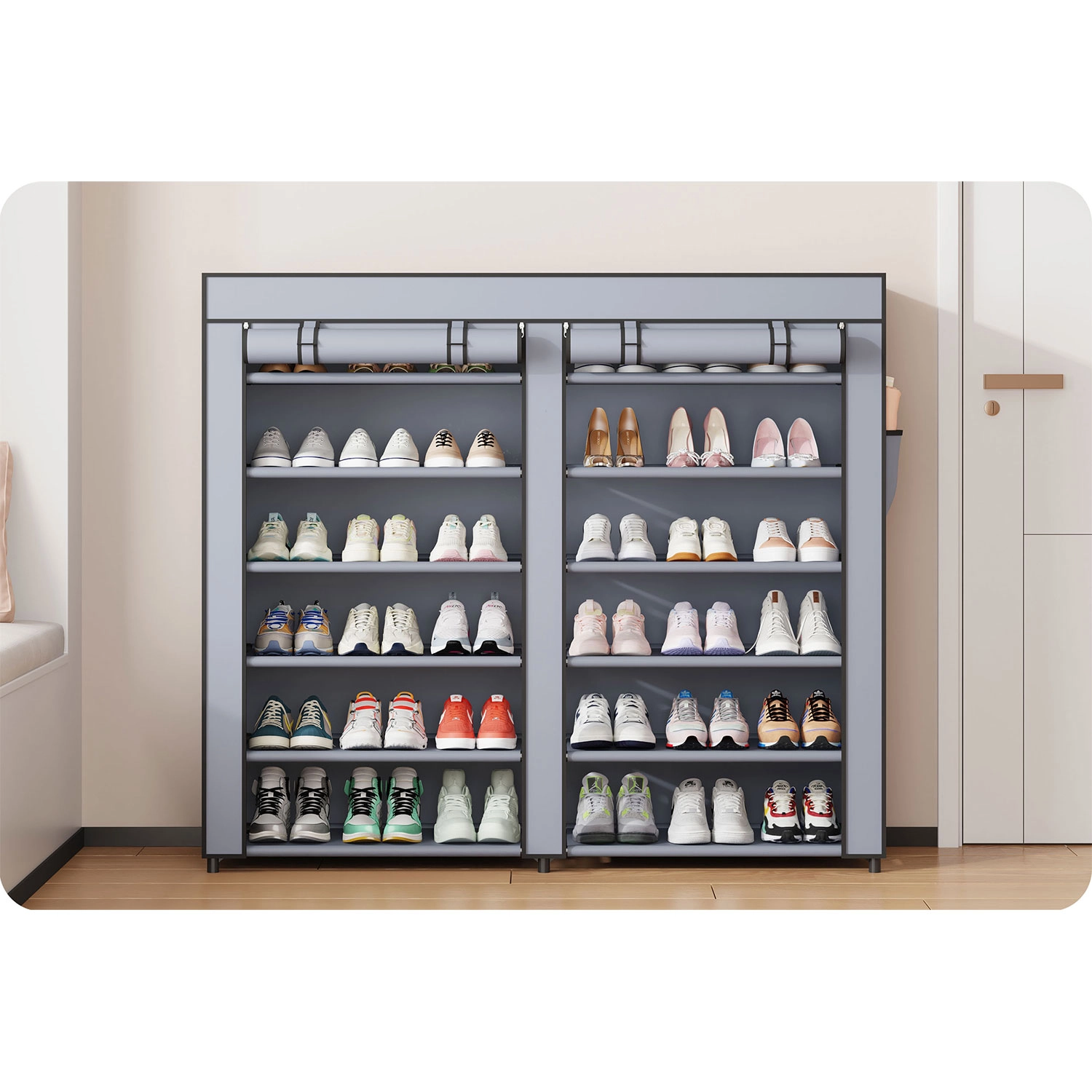 De praktische indeling van de legplanken biedt voldoende ruimte voor alledaagse schoenen en seizoensparen. Het zijvak is ideaal voor kleine items zoals impregneerspray, schoenlepels of borstels. De montage is zeer eenvoudig en vereist geen speciaal gereedschap.