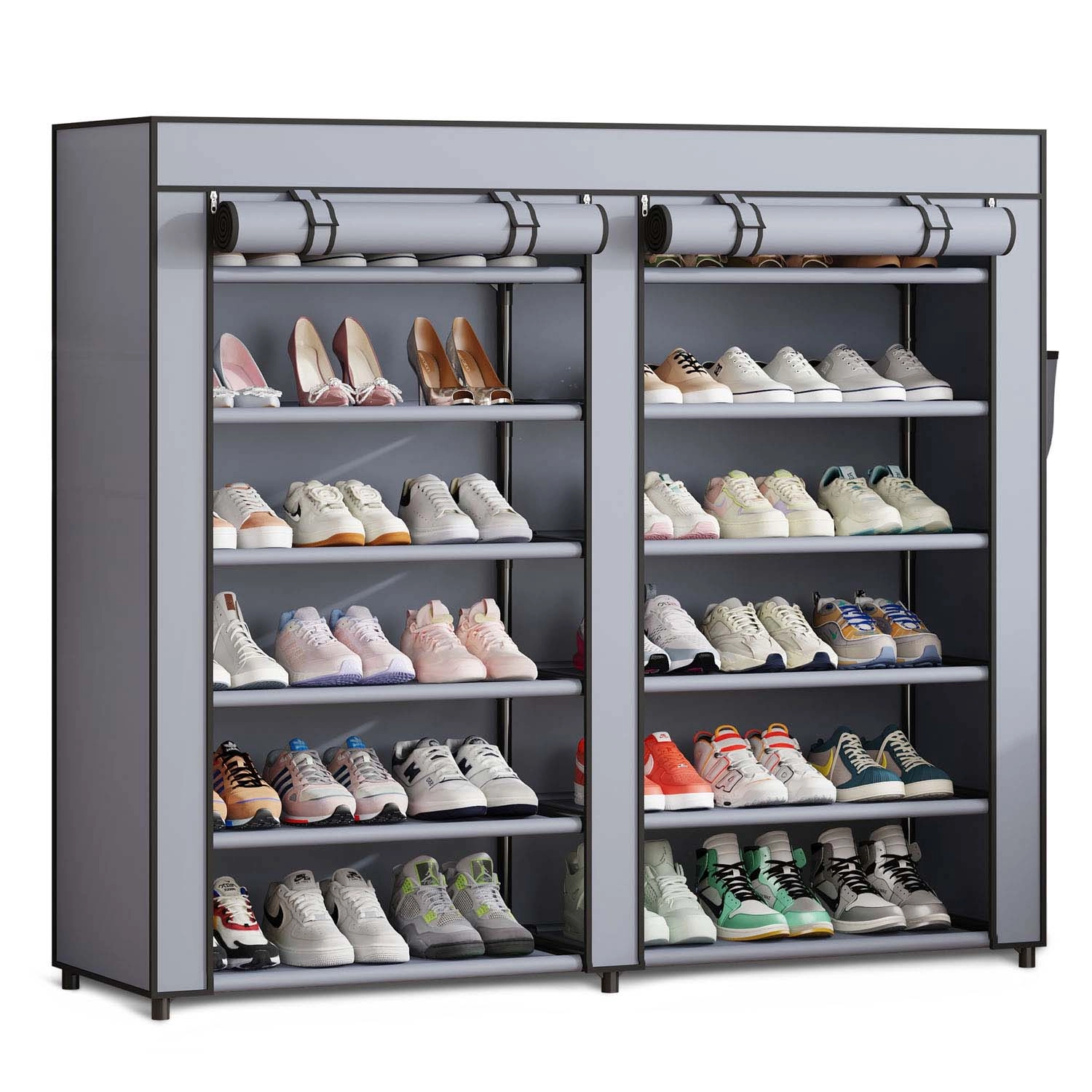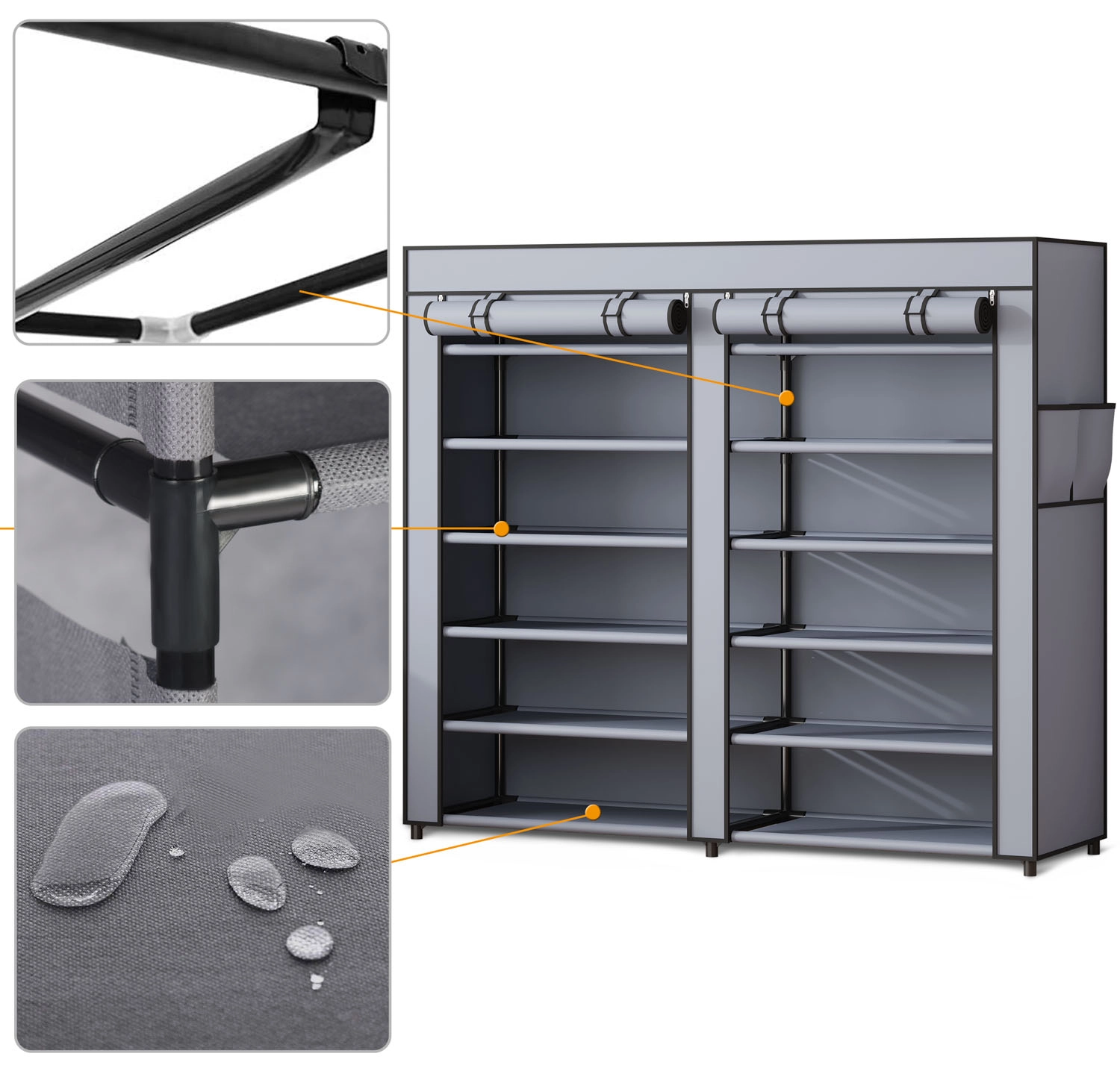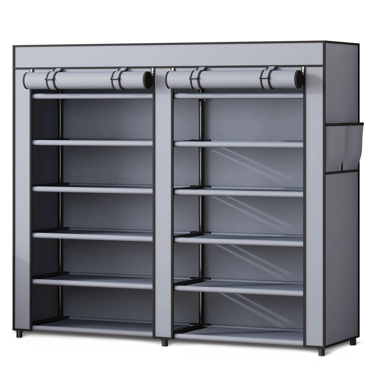 Houd orde in je schoenen stijlvol en moeiteloos. De textiele schoenenkast Massido combineert een duurzame stalen frame met een hoogwaardige waterafstotende bekleding, zodat je schoenen beschermd blijven tegen stof en vocht. De voorzijde sluit met vier ritsen, wat snelle toegang en overzichtelijke opslag mogelijk maakt.