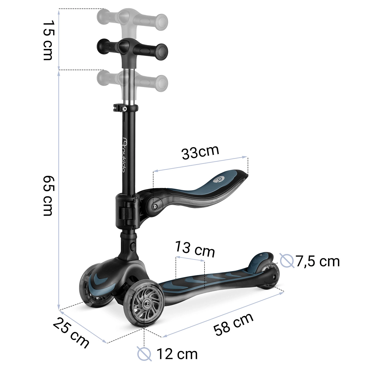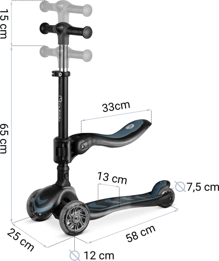 Driehoogteverstelling van het stuur en een verstelbaar, afneembaar zadel maken het mogelijk de step aan te passen aan de actuele lengte en vaardigheden van het kind.