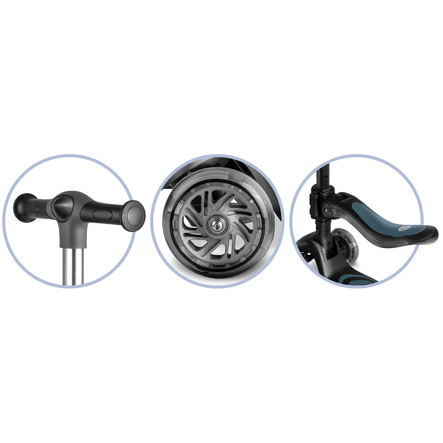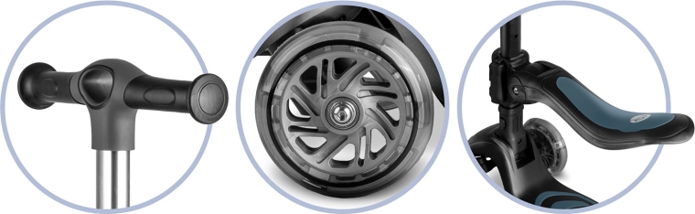 Praktische details zoals LED-verlichting in de wielen (dynamo zonder batterijen), een breed antislip deck en een krachtige voetrem bieden comfort en veiligheid tijdens het rijden. In hoogte verstelbaar stuur en zadel groeien met het kind mee, de lichte aluminium stuurstang vergemakkelijkt de bediening en de robuuste constructie staat garant voor langdurig gebruik.