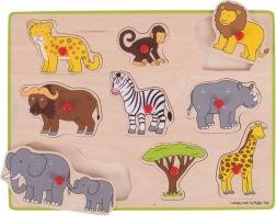 De houten inlegpuzzel Safari is ontworpen om kinderen te helpen hun vaardigheden, zintuiglijke vaardigheden en concentratie te ontwikkelen. Met zijn hulp leren kinderen gemakkelijk verschillende vormen en safari-dieren te herkennen.