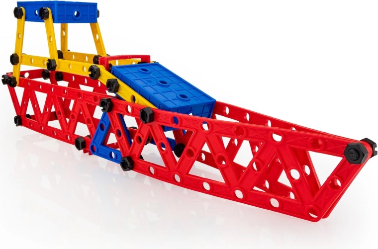 Dankzij de veelzijdige onderdelen kun je de meest uiteenlopende constructies maken – van dubbeldekker tot voertuigen en boten. Grote geperforeerde panelen, verbindingsstukken en liggers zijn eenvoudig te combineren, waardoor de set ideaal is voor zowel beginners als kleine bouwers die de principes van mechanica en basisnatuurkunde willen verkennen.