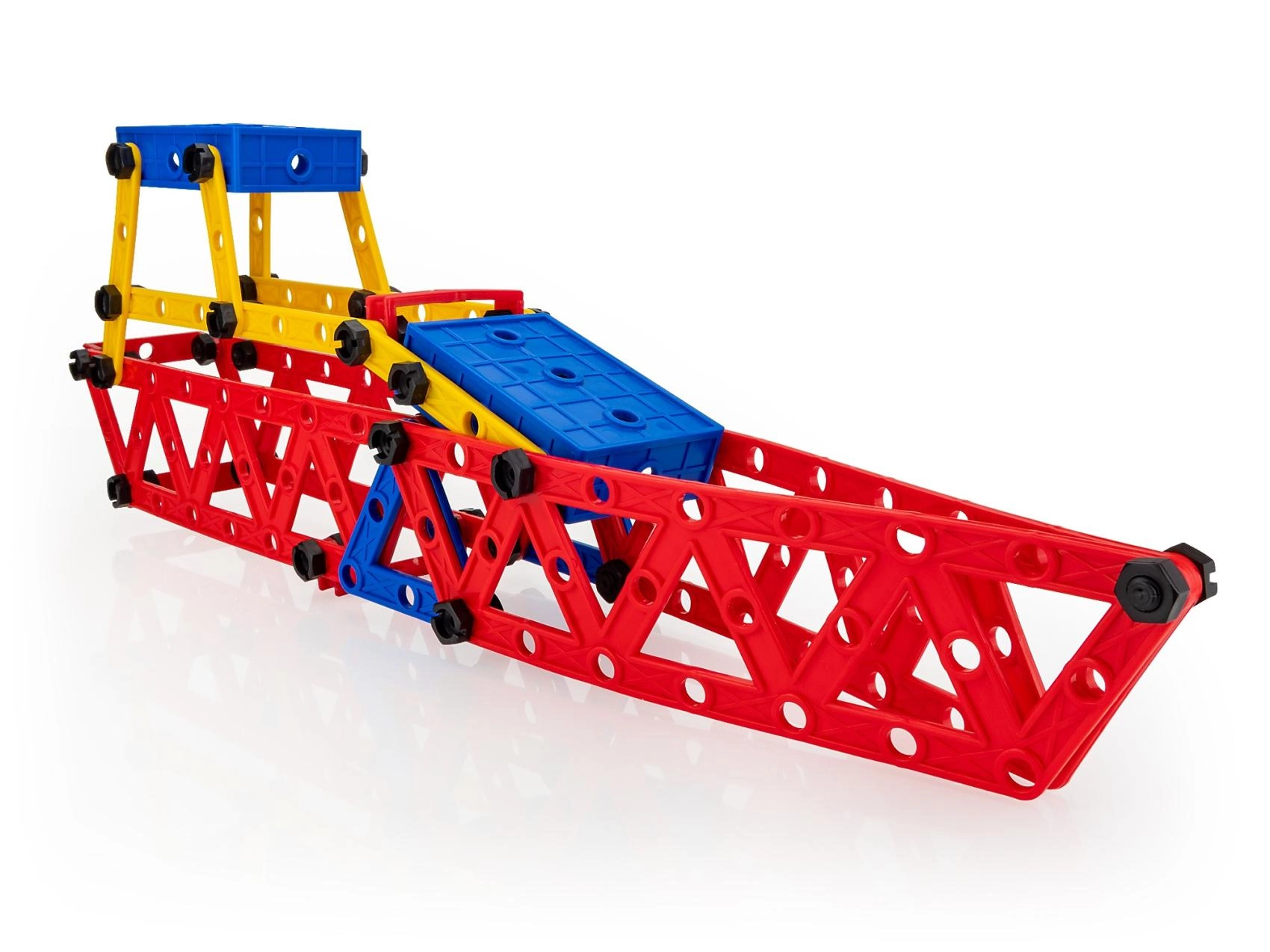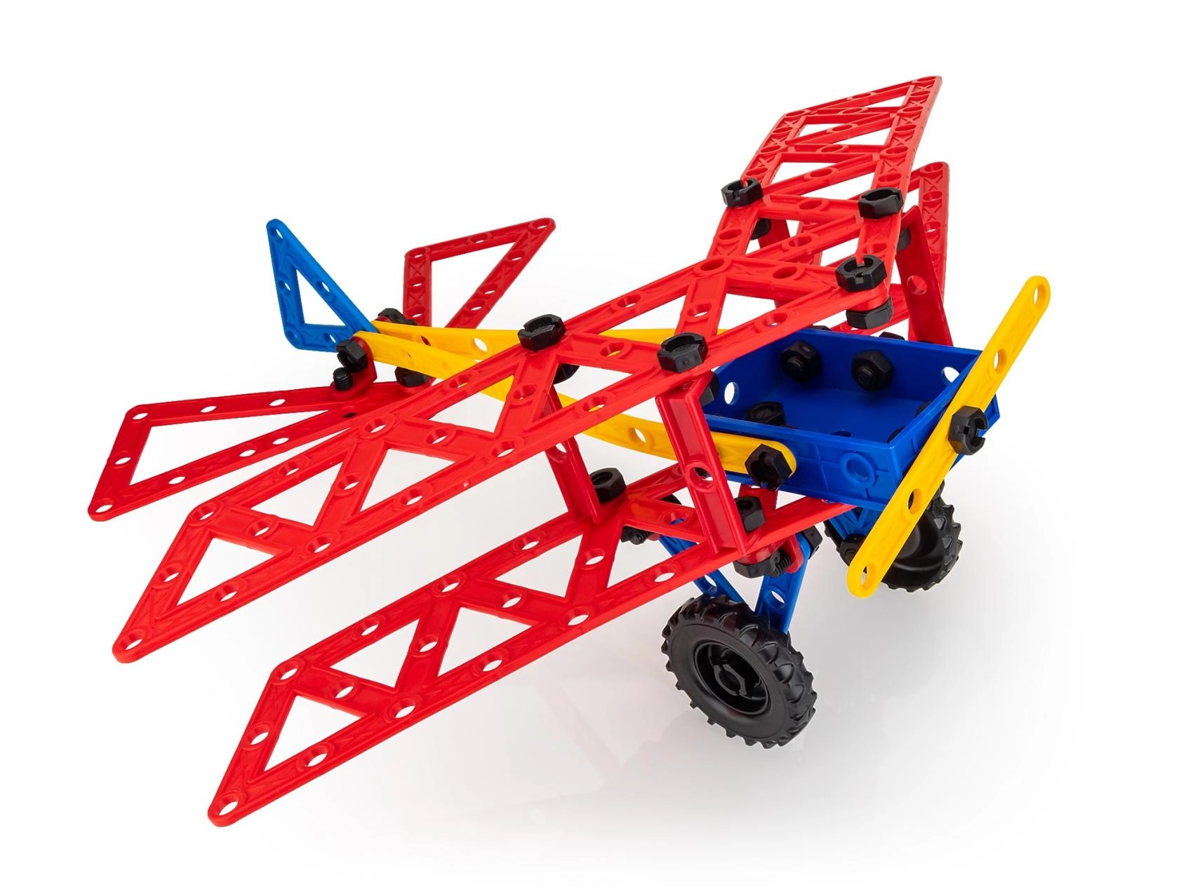 Grote geperforeerde panelen, liggers en verbindingsstukken maken het mogelijk om uiteenlopende modellen te bouwen, van vliegtuig tot boot – de verbeelding kent geen grenzen.