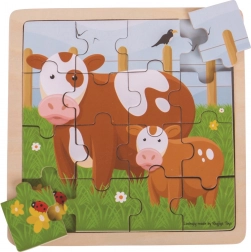 De zorgzame koe met haar kalfje nodigt kinderen uit naar de groene wei – een ontspannen legervaring die de fijne motoriek en het geduld bevordert. De stukjes zijn stevig, glad afgewerkt en afgestemd op kleine handjes, waardoor ze makkelijk te hanteren zijn. Dankzij het formaat 18 × 18 × 1 cm is de puzzel geschikt voor thuis én onderweg.