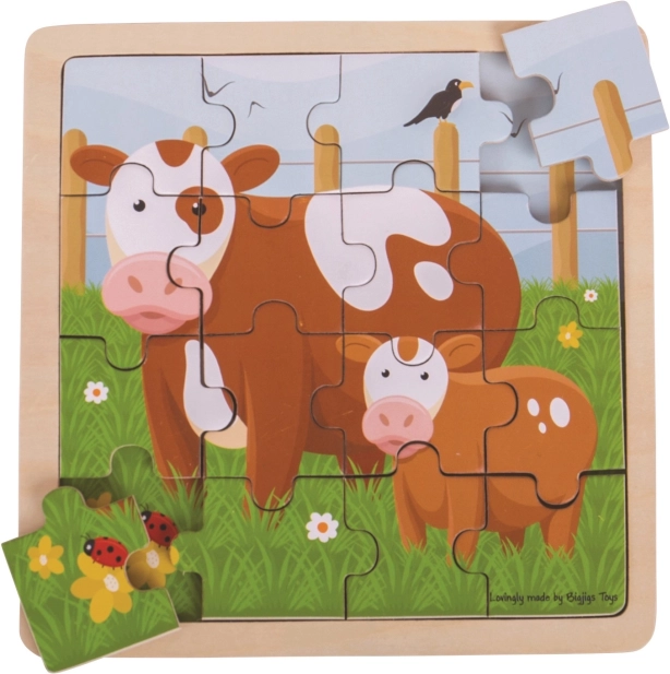 Schattige houten puzzel koe met kalfje van Bigjigs Toys maakt kinderen vanaf 2 jaar blij. Bevat 16 stukjes met onderplaat en frame voor eenvoudig leggen. De stukjes zijn gemakkelijk vast te pakken en het speelgoed stimuleert motoriek, woordenschat, fantasie en concentratie. Gemaakt van verantwoord verkregen hout in overeenstemming met Europese normen.