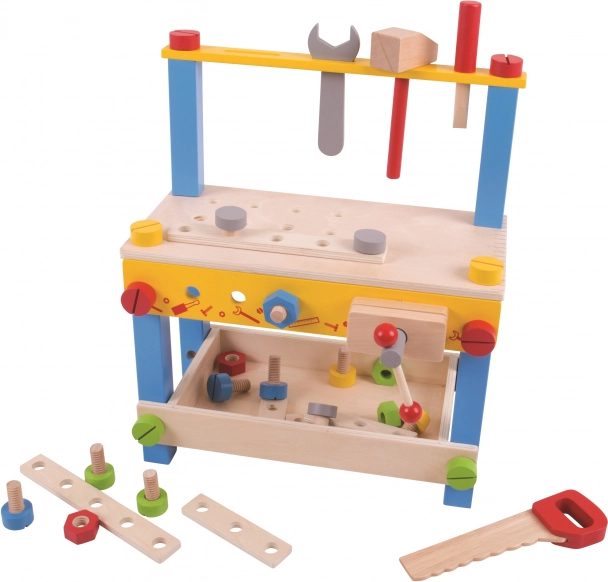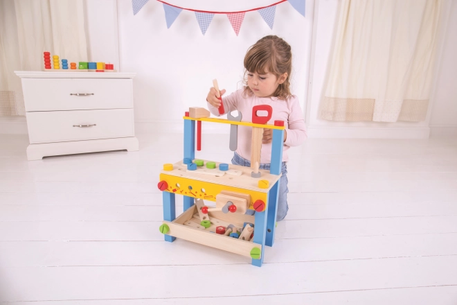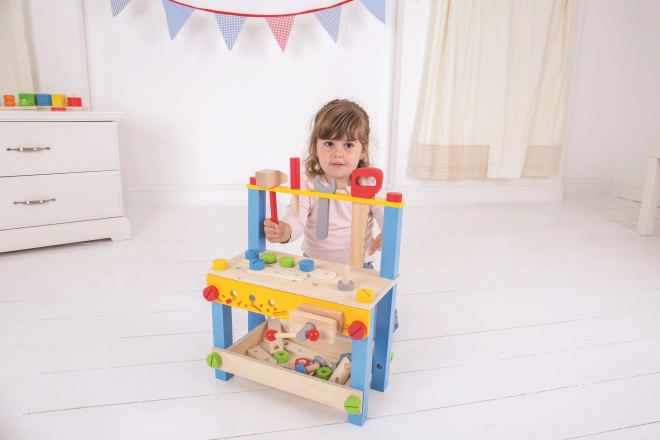 Deze kleurrijke houten werkbank van BIGJIGS TOYS is een geweldige start in de wereld van gereedschap. Dankzij realistische elementen en veilige houten tools oefenen kinderen praktische vaardigheden en leren ze de basisprincipes van het werken met gereedschap – op een speelse en veilige manier.