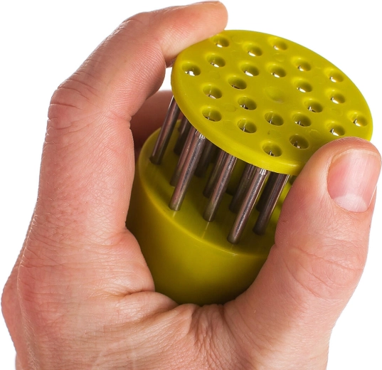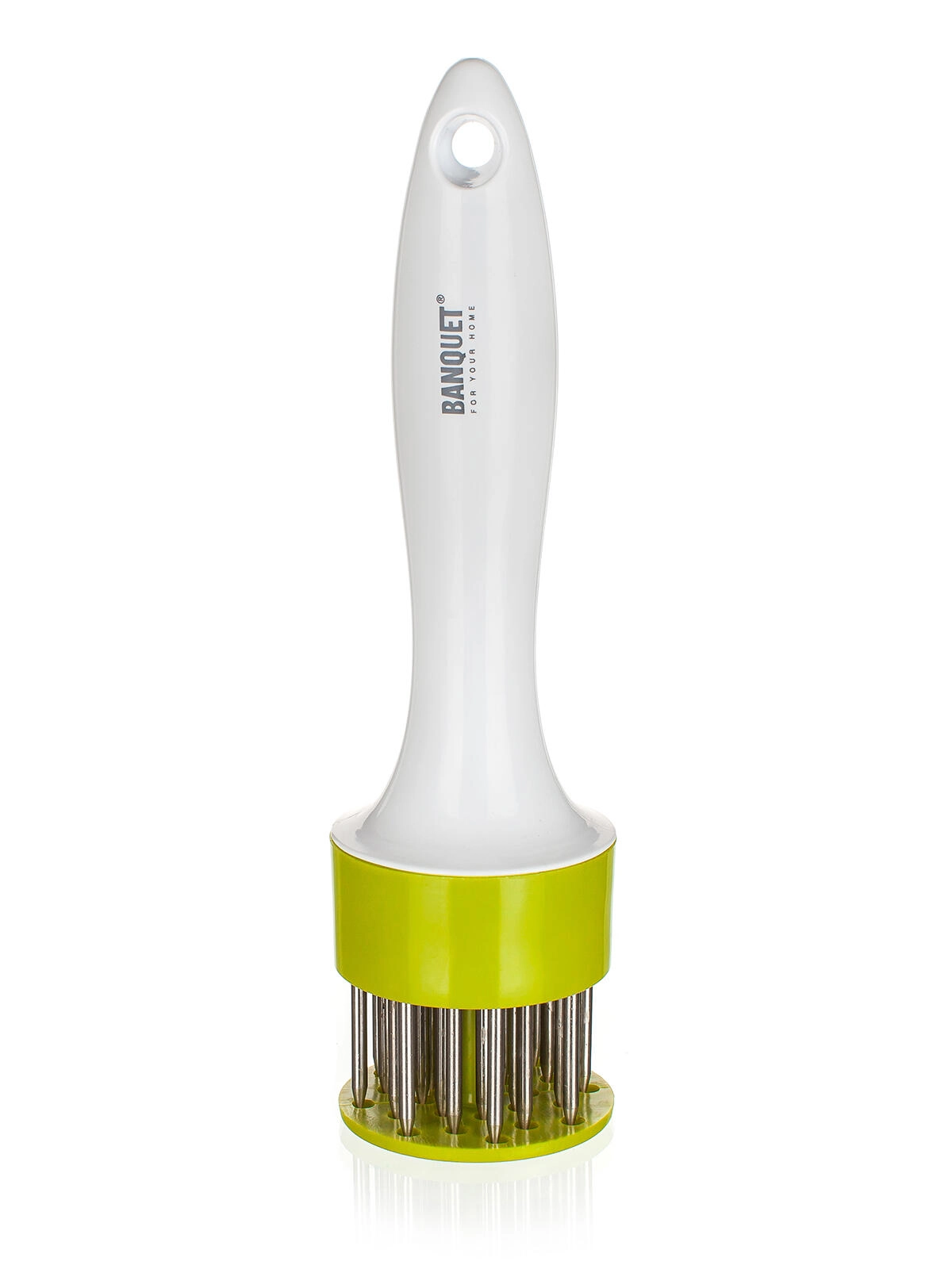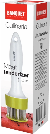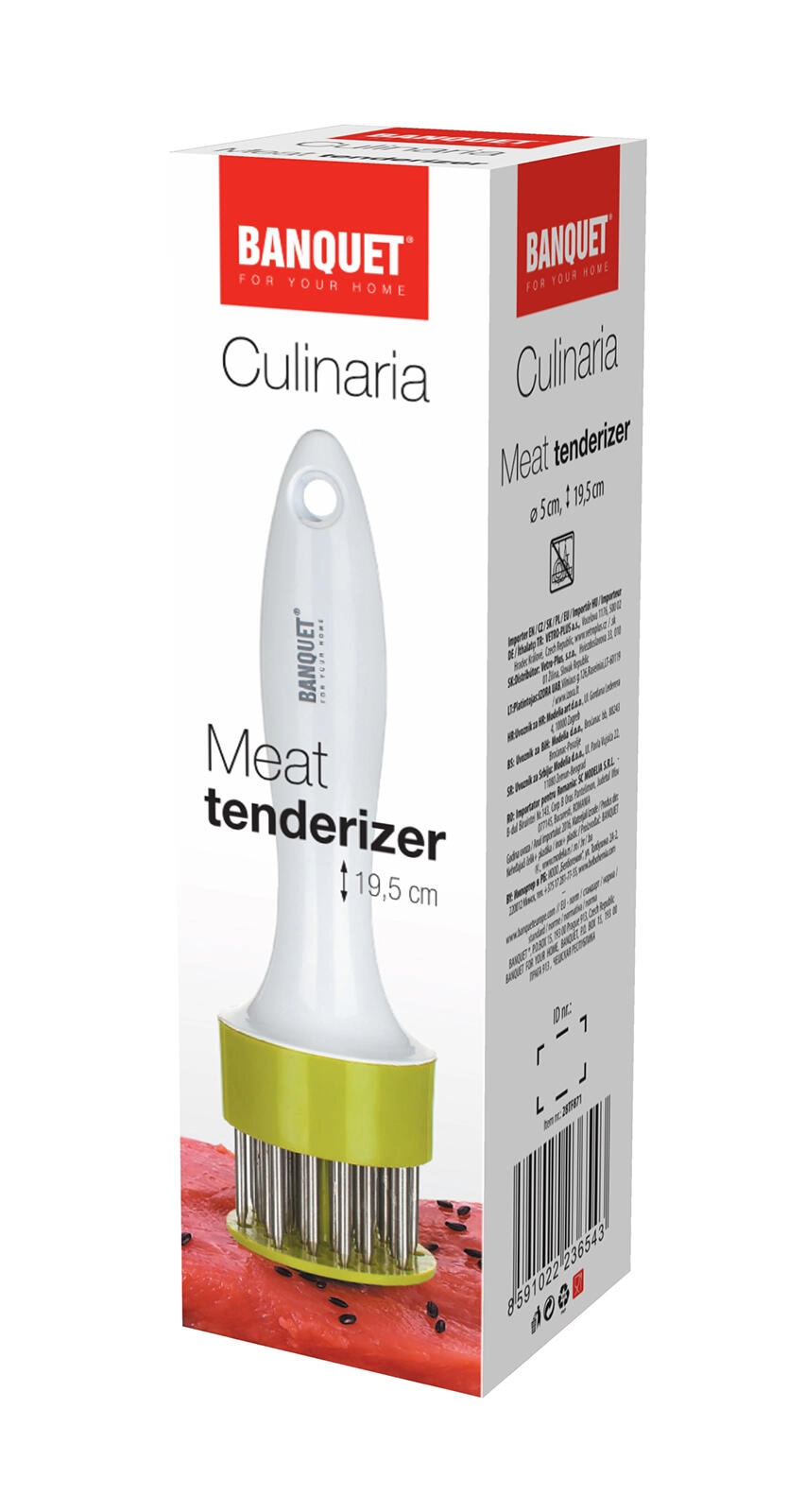 De Culinaria vleesvermalser is de ideale hulp voor dagelijks koken en voor de bereiding van feestelijke gerechten. Het dichte veld van roestvrijstalen pennen verluchtigt en snijdt de spiervezels in, wat zorgt voor gelijkmatigere garing en een aanzienlijk betere opname van kruiden en marinades. Perfect voor iedereen die zijn vlees altijd mals en sappig wil hebben.
