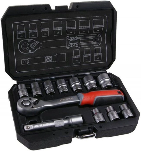 Professionele dopsleutelset 1/2" met 12 delen van het merk FESTA voor veeleisend én thuisgebruik. Biedt chroom-vanadiumstaal, nikkel-oppervlakteafwerking, een ratel met 72 tanden en een ergonomische handgreep. Geleverd in een stevige kunststof koffer met 10 jaar garantie.