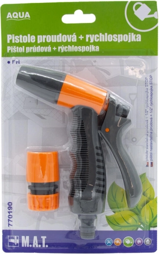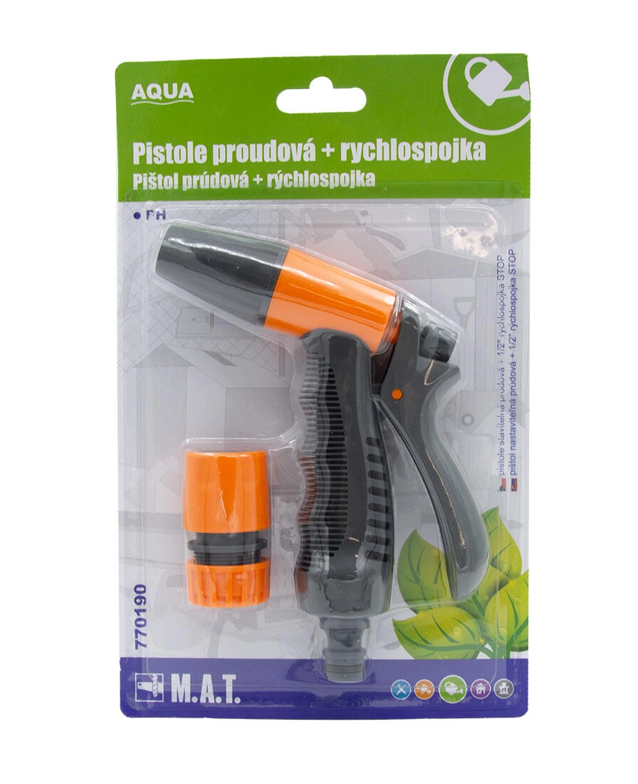 Praktische set voor tuinslangen bevat een verstelbaar sproeipistool en een STOP-snelkoppeling 1/2" voor het direct stoppen van de waterstroom bij het loskoppelen. Ideaal voor comfortabel bewateren, afspoelen en tuinonderhoud met eenvoudige bediening en betrouwbare kunststof uitvoering.