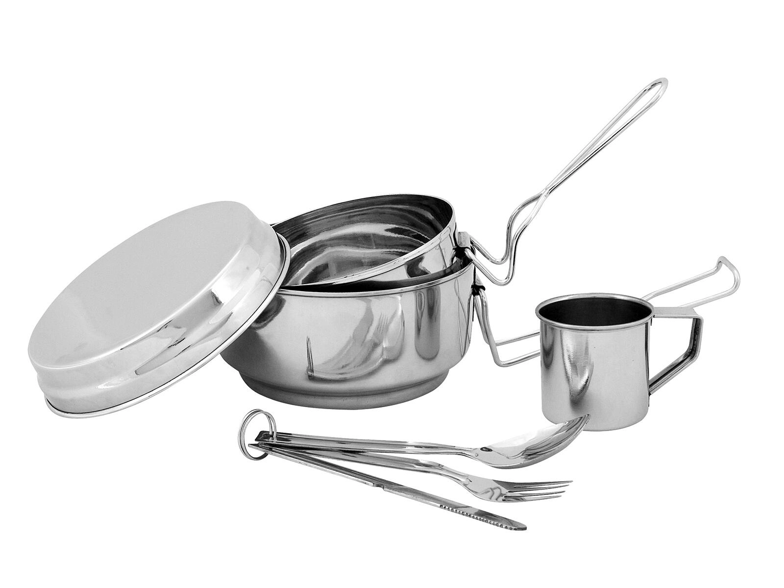 Twee ešus-pannen (15 cm en 13 cm), een deksel, een metalen beker en een driedelige bestekset dekken de behoeften voor koken en tafelen in de natuur.