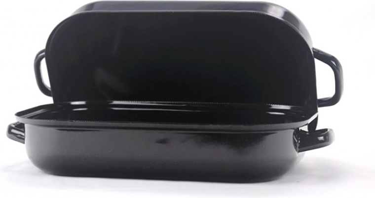 Universele geëmailleerde braadslede met deksel, afmetingen 35 × 24 cm en hoogte 13,5 cm, ideaal voor het braden van vlees, groenten en gegratineerde gerechten. Dankzij het gladde geëmailleerde oppervlak is hij makkelijk schoon te maken, verdeelt hij de warmte gelijkmatig en is hij geschikt voor alle soorten kookplaten, inclusief inductie, en voor de vaatwasser. De speciale gerasterde bodem zorgt voor sappig en gelijkmatig braden.