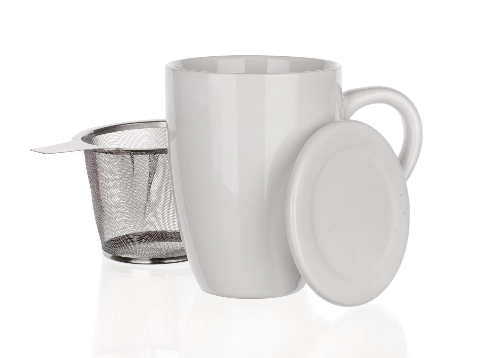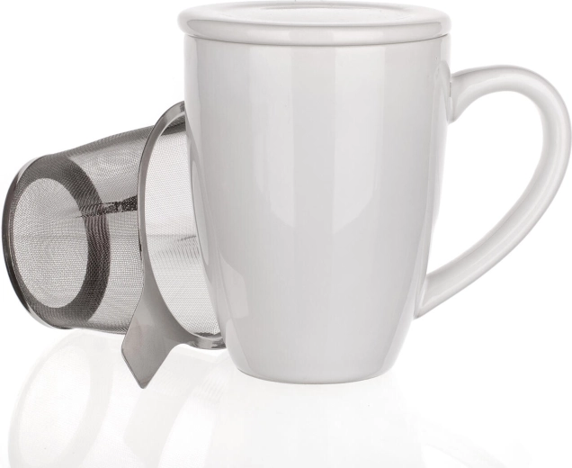 Praktische en elegante witte mok van 350 ml met deksel en een roestvrijstalen zeef voor het gemakkelijk trekken van losse thee direct in de kop. Dankzij het deksel voor het behouden van de temperatuur en de fijne zeef geniet je van een volle smaak zonder blaadjes en kruimels. Ideaal voor dagelijks gebruik thuis en op kantoor.