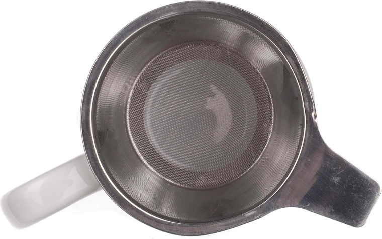 Deze witte keramische mok met een inhoud van 350 ml is een uitstekende keuze voor liefhebbers van losse thee. De afneembare roestvrijstalen zeef met fijne mazen zorgt voor een schone infusie zonder onzuiverheden en het deksel helpt de drank langer warm te houden. Na het trekken kan het deksel ook worden gebruikt als praktische opvangschaal voor de zeef.