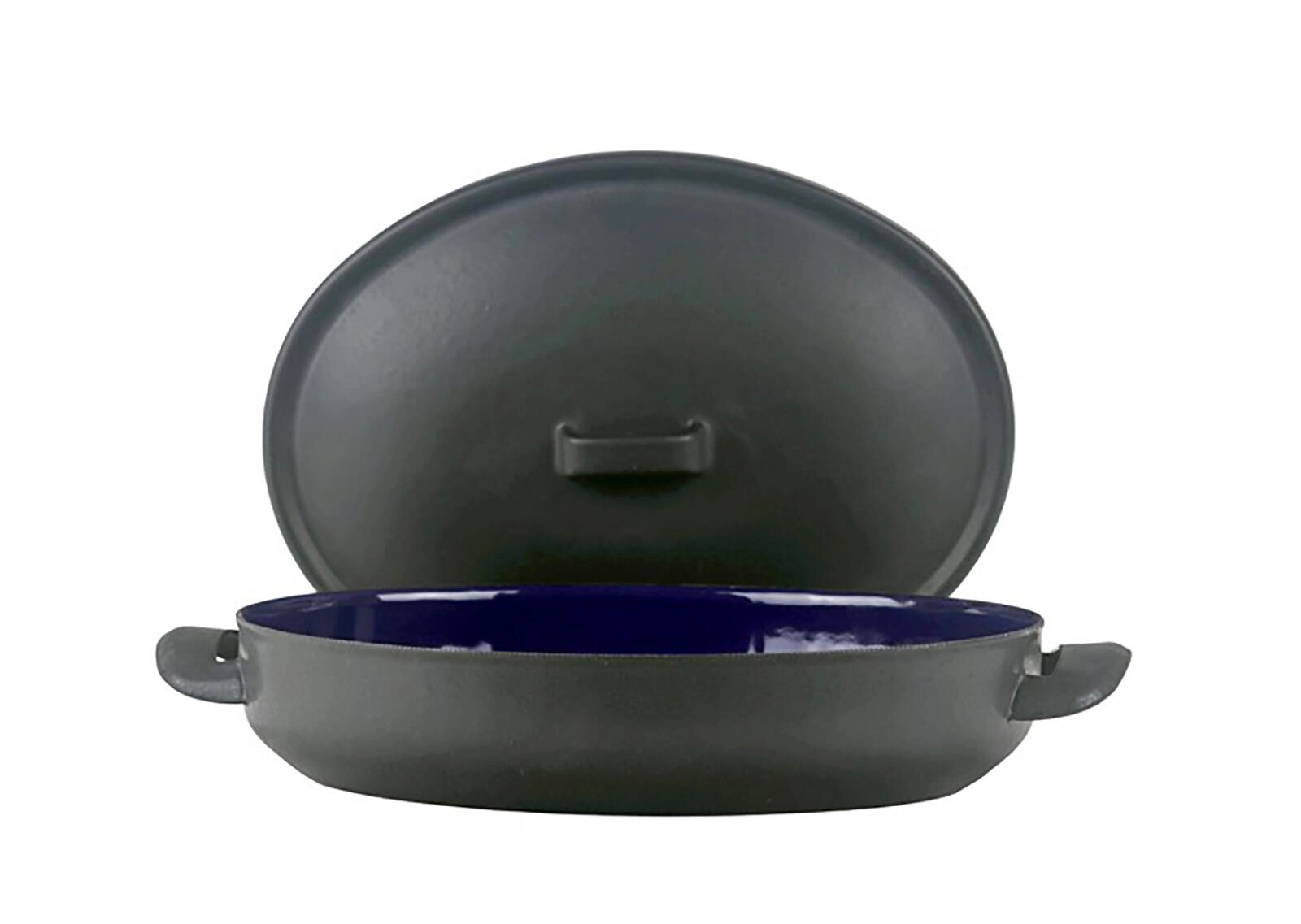 De ovale vorm met een afsluitend deksel houdt vocht en smaak vast – perfect voor vis, groenten en kleinere braadstukken.