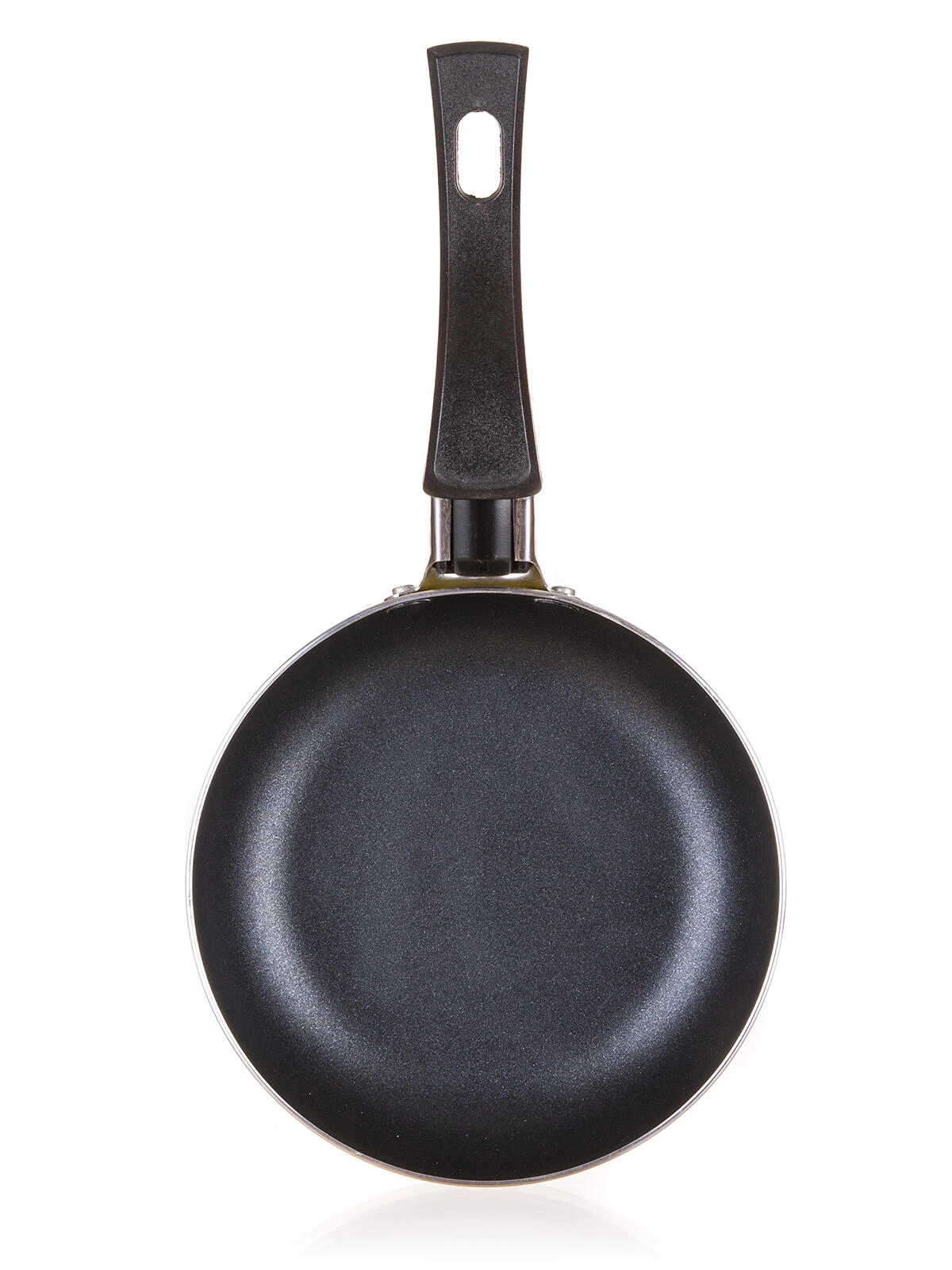 Compacte mini pan met een diameter van 14 cm voor het snel bakken van eieren, pannenkoeken of kleinere porties. Dankzij de twee­laagse antiaanbaklaag koekt het eten niet aan en is schoonmaken eenvoudig. De ergonomische bakelieten handgreep blijft koel, terwijl de spiraalbodem zorgt voor een gelijkmatige warmteverdeling. Geschikt voor gas, elektrisch en keramisch, en vaatwasserbestendig.