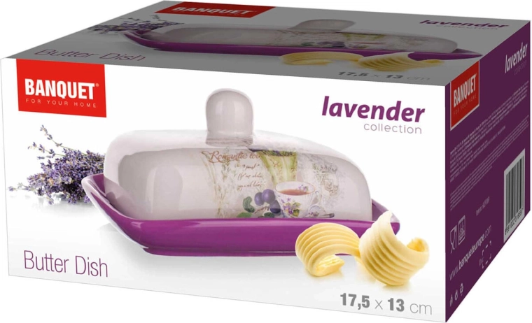 De elegante keramische botervloot Lavender is ideaal voor dagelijks tafelen en feestelijke momenten. De hoogwaardige glazuur in paars en wit beschermt het oppervlak, maakt schoonmaken eenvoudig en benadrukt het romantische lavendeldecor.