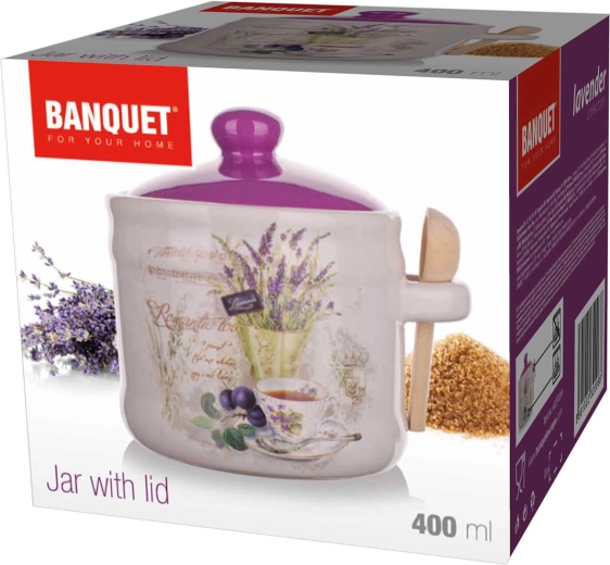 Stijlvolle keramische voorraadpot met een inhoud van 400 ml in LAVENDER-design, ideaal voor suiker, zout of kruiden. Dankzij het goed sluitende deksel en het meegeleverde houten lepeltje biedt het een praktische en esthetische opslagoplossing. Keramische uitvoering, praktisch houten lepeltje en subtiele lavendeldecoratie maken je keuken tot in de puntjes af.