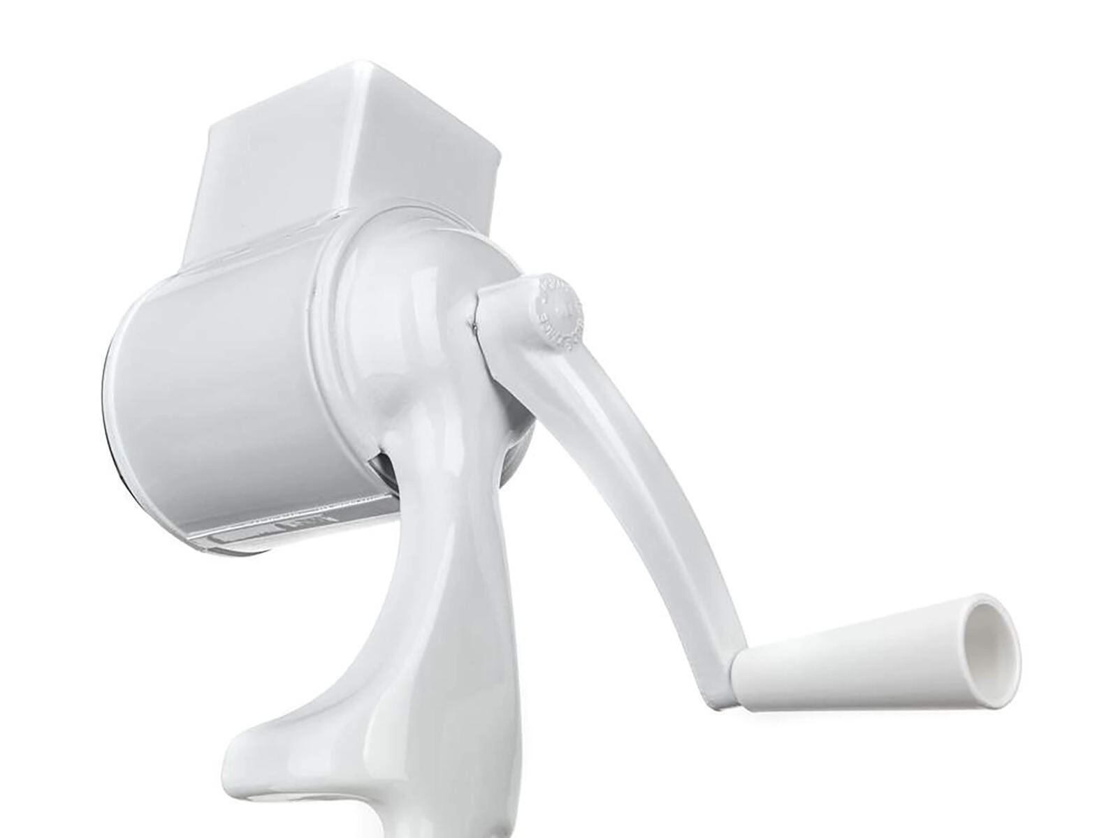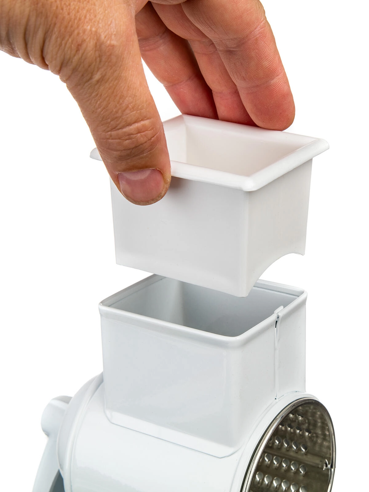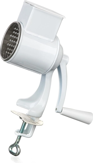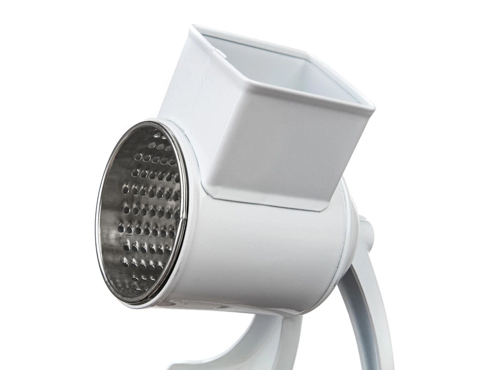 De kwalitatieve trommel van vertind plaatstaal met een diameter van 7,5 cm zorgt voor gelijkmatig raspen en een lange levensduur, zelfs bij frequent gebruik.