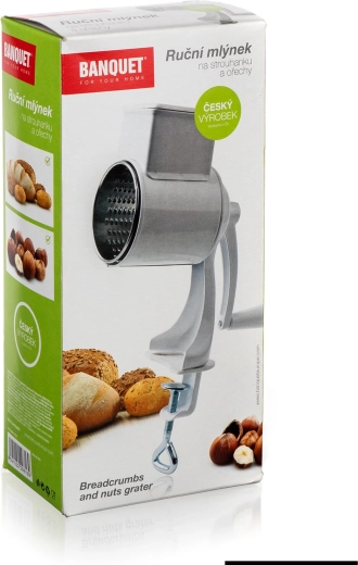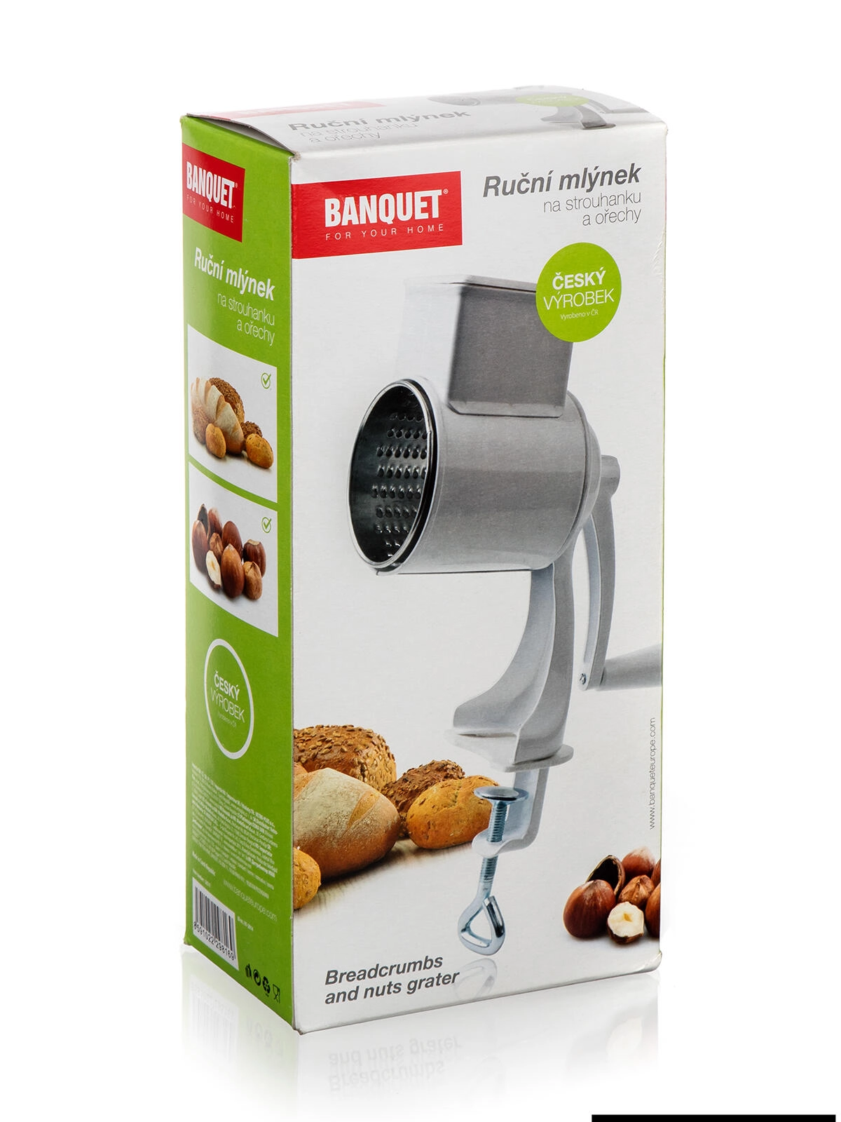 De handmatige paneermeel-molen BANQUET is ideaal voor dagelijks gebruik – van fijn paneermeel uit brood tot snel raspen van harde kazen en noten. De metalen behuizing met duurzame afwerking en de vertinde trommel garanderen een lange levensduur en eenvoudig onderhoud.