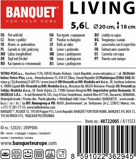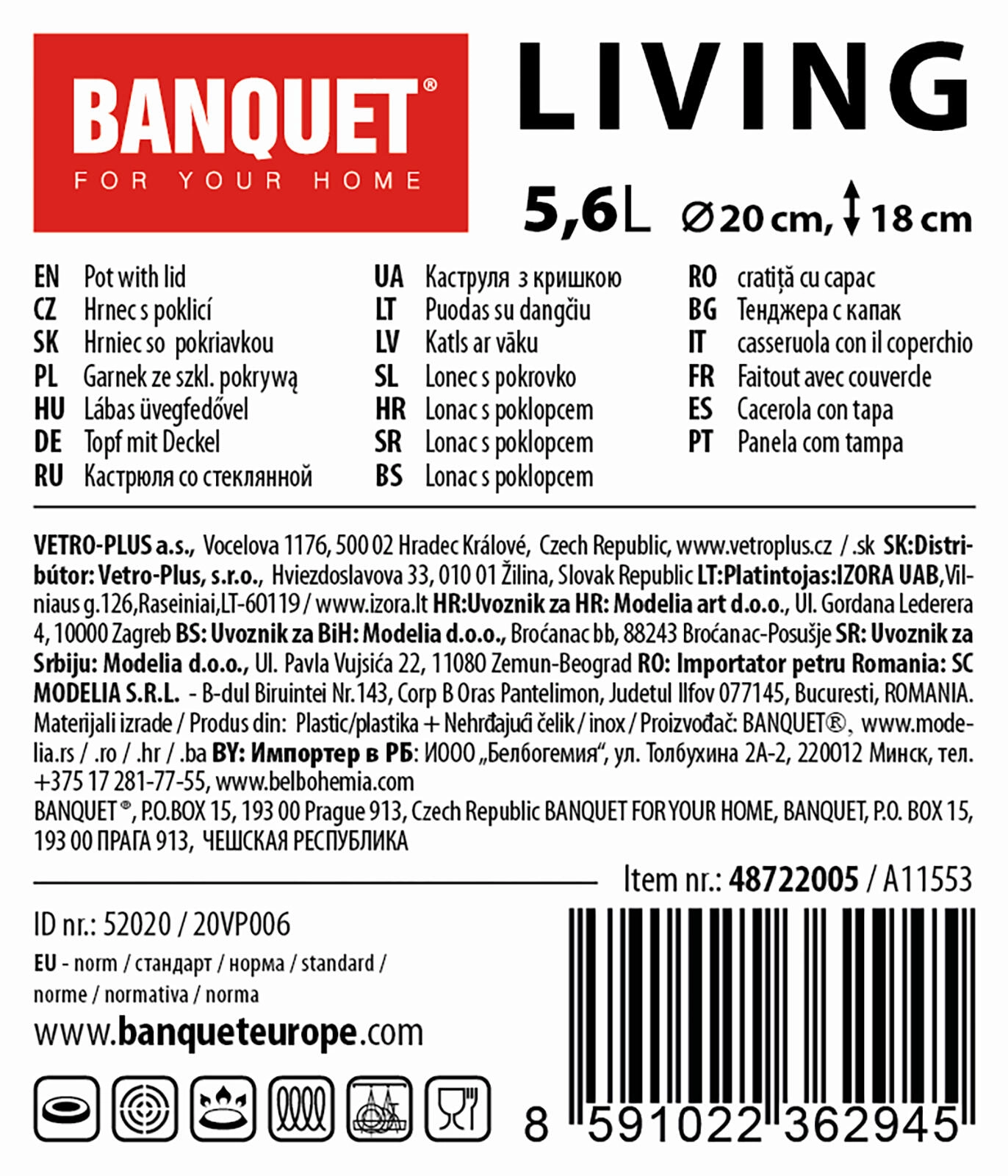 Praktische en elegante roestvrijstalen pan LIVING met een inhoud van 5,6 l en een diameter van 20 cm, ideaal voor dagelijks koken. Biedt een duurzame roestvrijstalen uitvoering, een glazen deksel met roestvrijstalen knop, een glanzend oppervlak met matte strepen en universele compatibiliteit met alle soorten kookplaten, inclusief inductie.