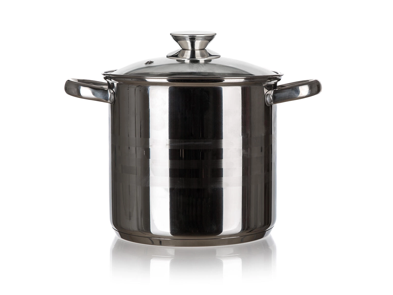 Praktische roestvrijstalen pan LIVING met een inhoud van 7,2 l en een diameter van 22 cm, ideaal voor het koken van soepen, sauzen en pasta. Voorzien van een glazen deksel met roestvrijstalen knop, geschikt voor alle soorten kookplaten, inclusief inductie, en duurzame RVS-uitvoering met een glanzend oppervlak en drie matte ringen voor een elegante uitstraling.