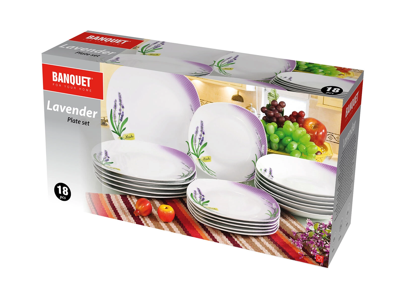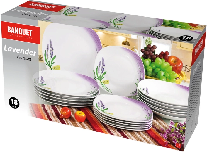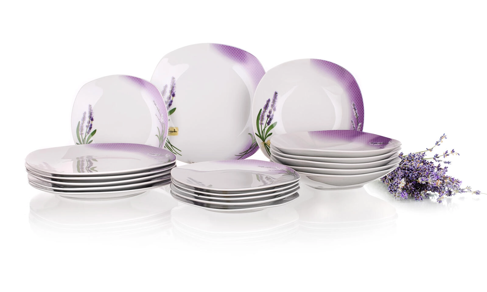 18 delen omvatten diepe, platte en dessertborden – allemaal in de uniforme Lavender Square-stijl voor een perfect gedekte tafel, elke dag.