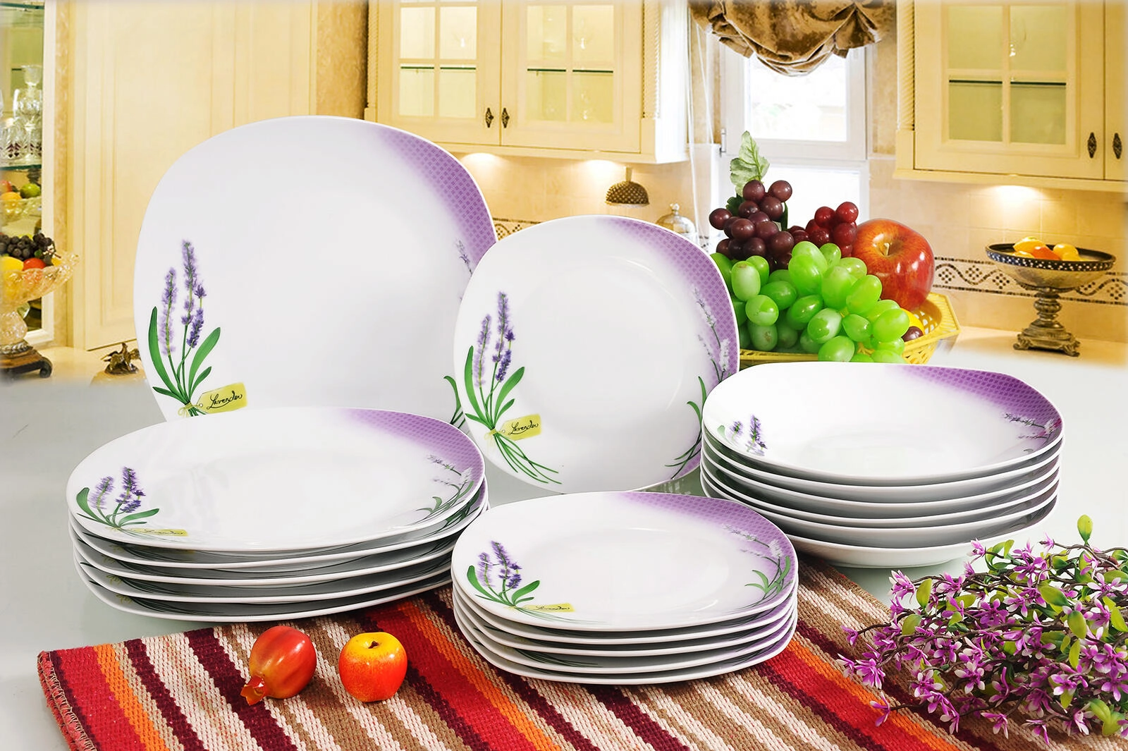 Kies voor een combinatie van stijl en functionaliteit. De Lavender Square dinerset van duurzaam porselein valt op door de moderne vierkante vorm met afgeronde hoeken en het subtiele lavendeldecor, dat zowel alledaagse maaltijden als feestelijke gelegenheden prachtig complementeert. Het oppervlak is glad en makkelijk te reinigen, de borden zijn stapelbaar en besparen ruimte in het keukenkastje.