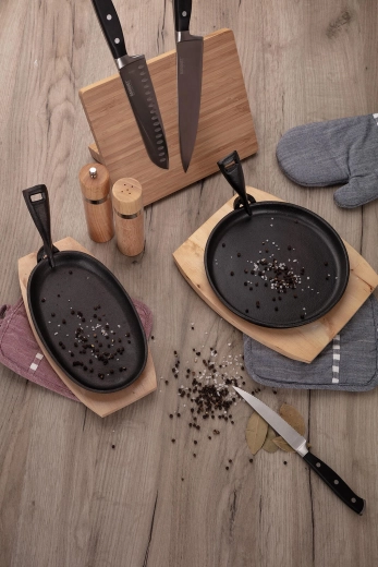 De GRADA gietijzeren pan met een diameter van 22 cm is ontworpen voor intensief dagelijks gebruik. Het zware gietijzer behoudt en verdeelt warmte gelijkmatig, zodat je een perfect geschroeide, knapperige korst en een sappige binnenkant krijgt. Bijgeleverd is een houten plank die dient als onderzetter voor veilig en stijlvol serveren direct aan tafel.