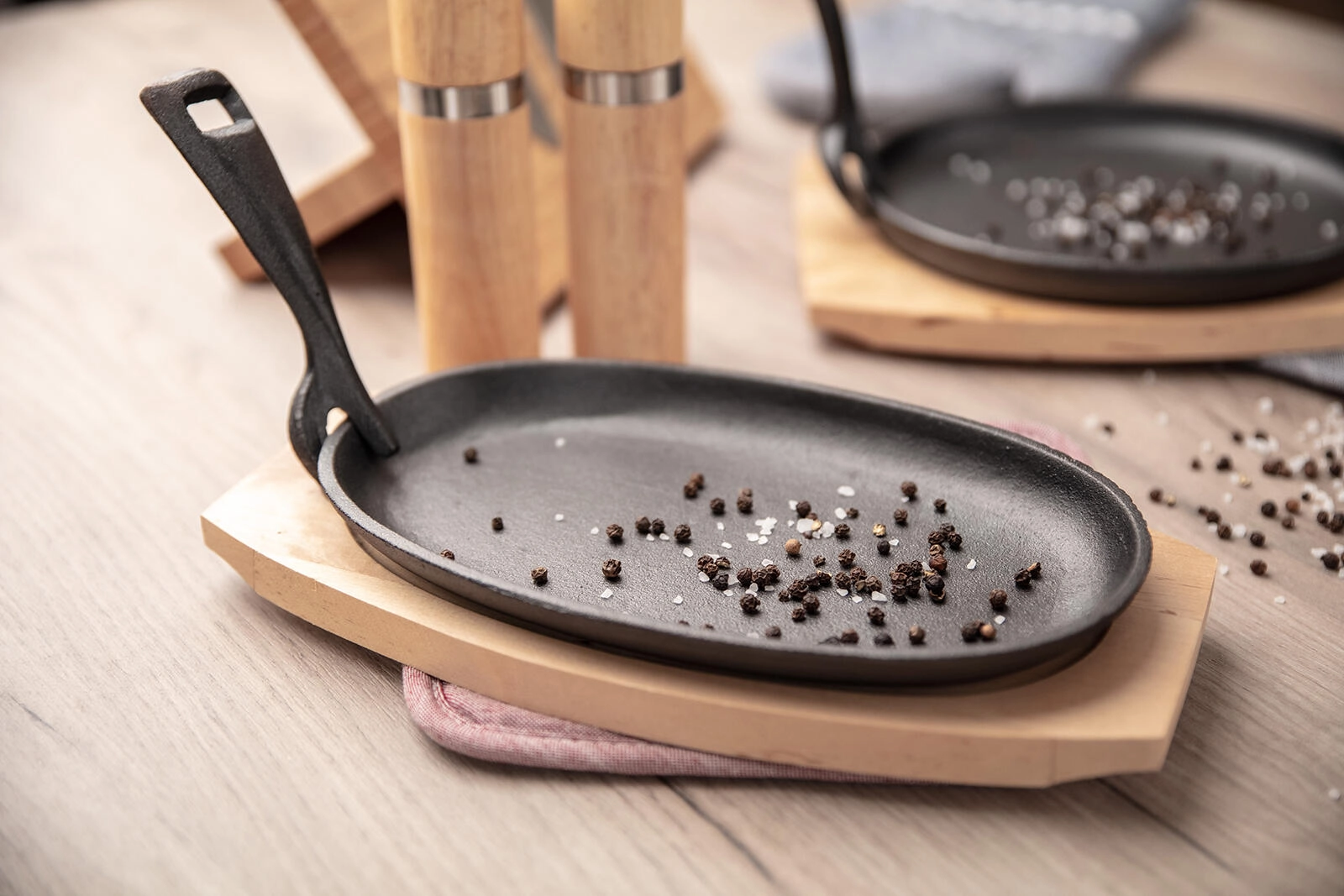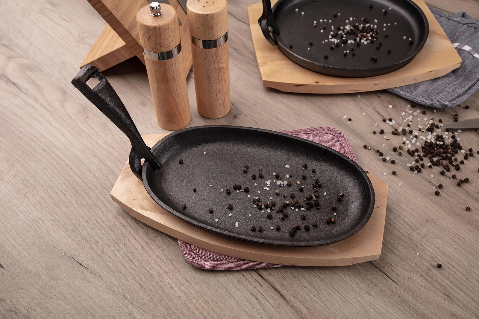 De gietijzeren pan houdt warmte vast en met de houten plank zet je haar veilig op tafel – het eten blijft heet en verleidelijk sissend.