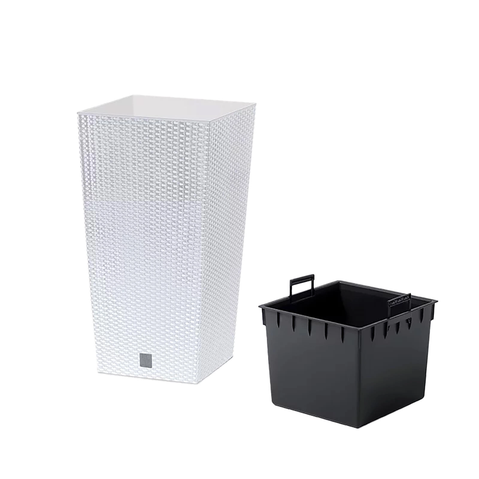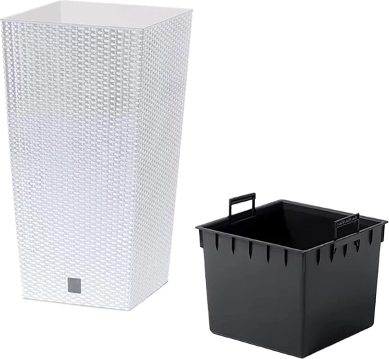 Elegante plastic bloempot met een ratanlook voor interieur, terras en balkon. Biedt twee volumes voor beplanting, is licht, duurzaam en eenvoudig te onderhouden. Modern design, realistische ratanimitatie en praktische afmetingen 26,5 × 26,5 × 50 cm maken hem ideaal voor kruiden, bloemen en decoratieve planten.