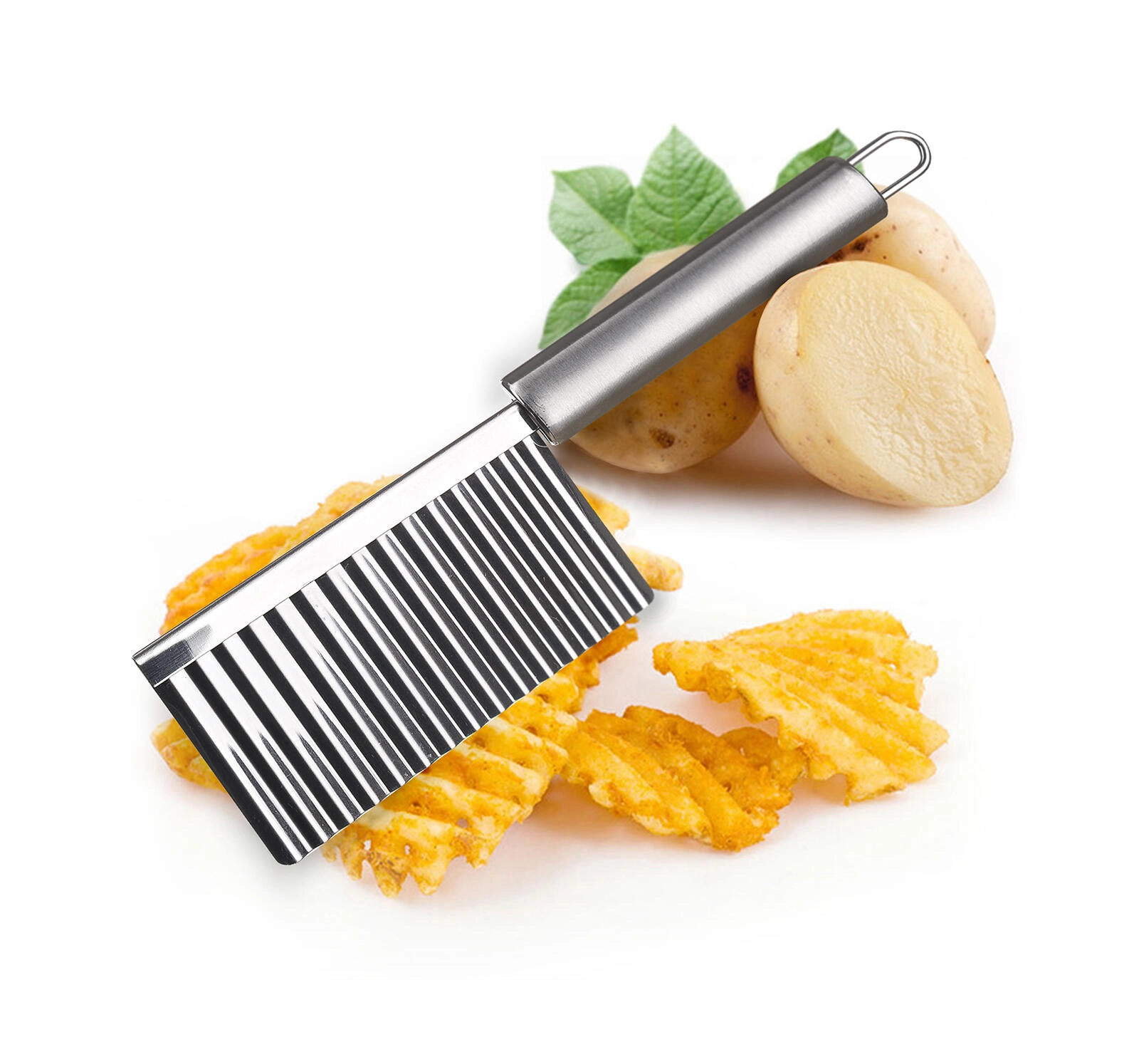 Het gekartelde snijvlak creëert regelmatige golven op aardappelen, groenten en kaas – ideaal voor frietjes en decoratieve plakjes.