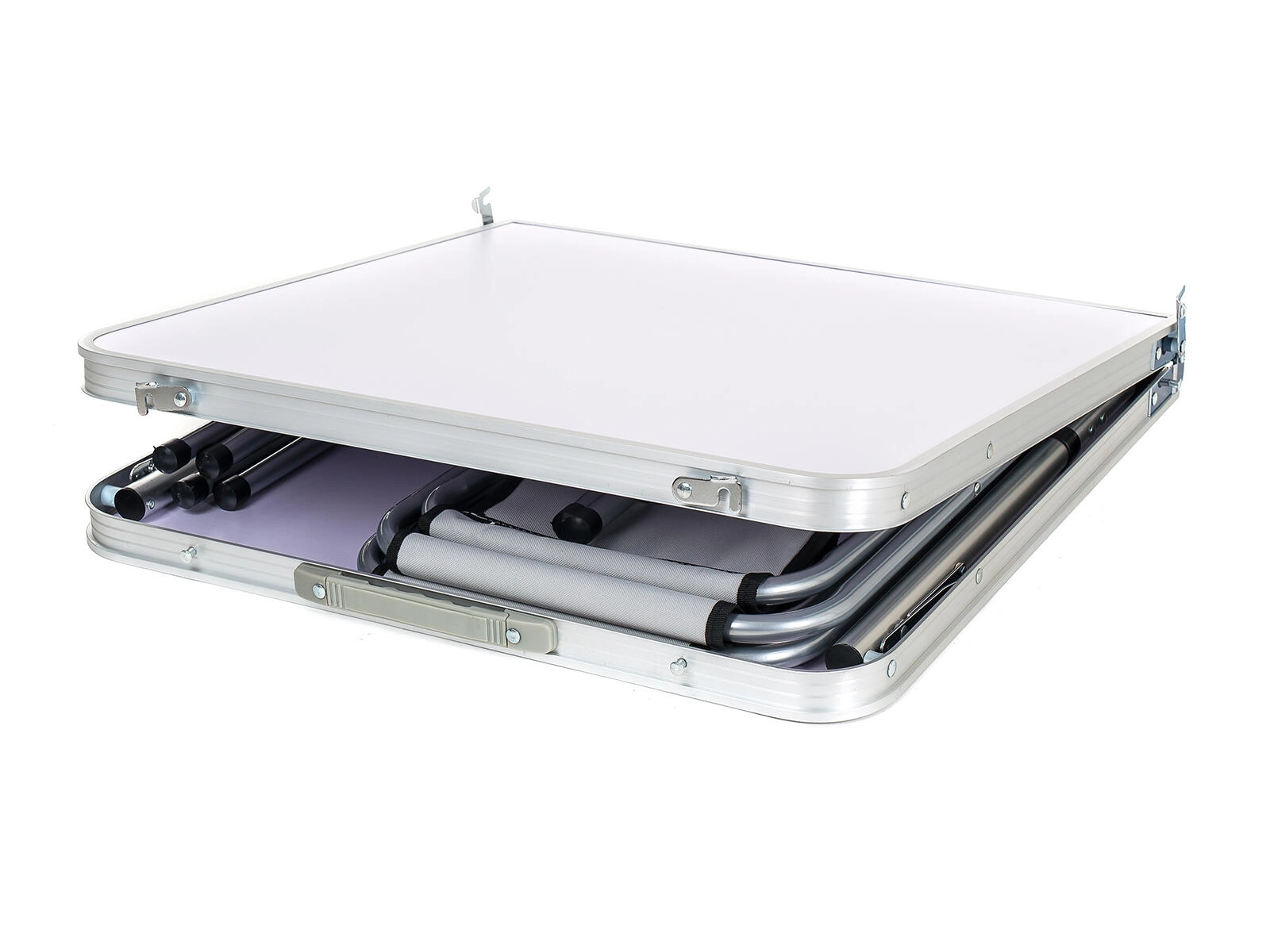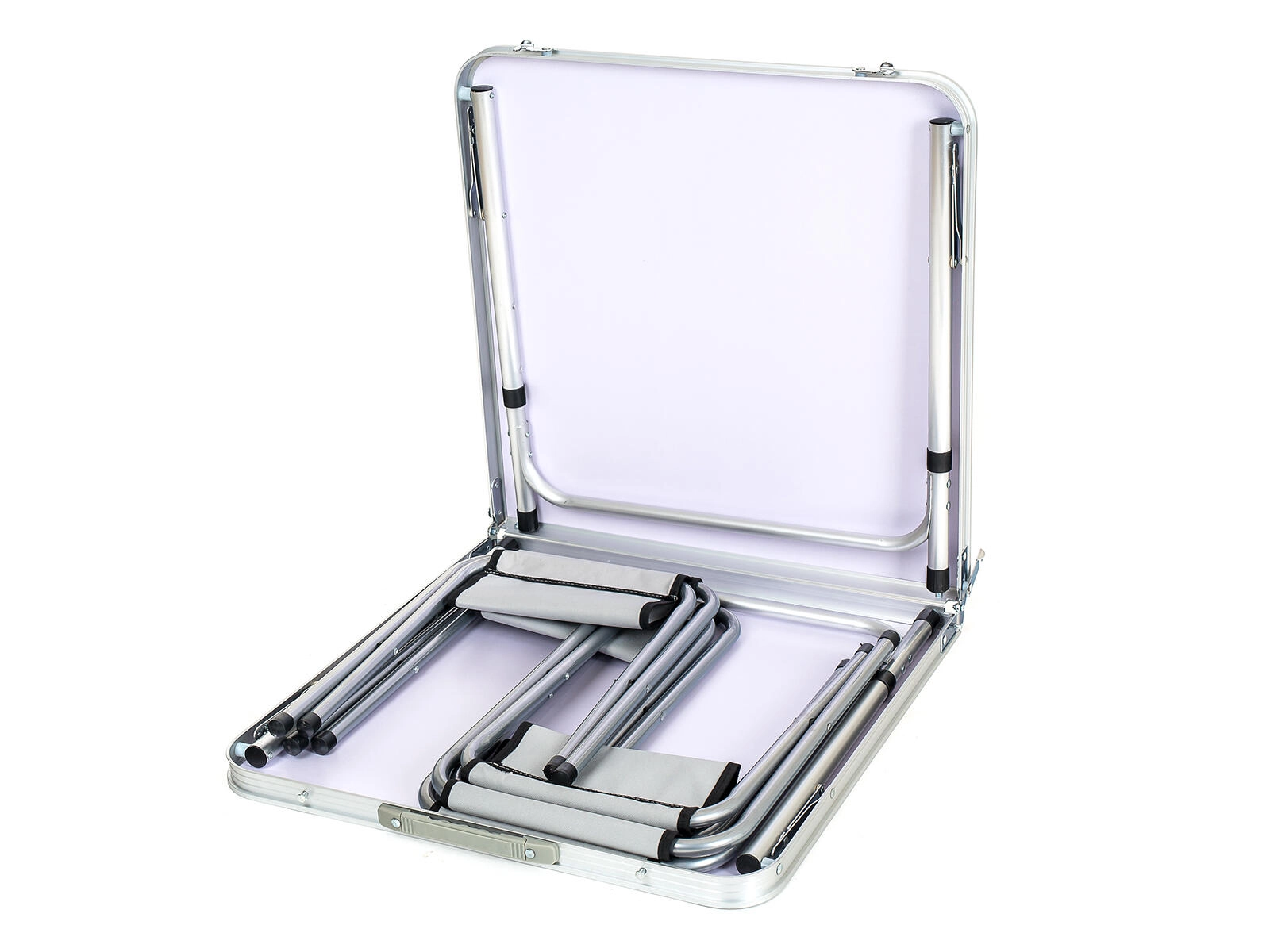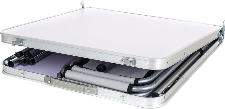 De hele set vouw je in een handomdraai op tot een compacte koffer met afmetingen 62 × 7,5 × 63 cm met handvat voor comfortabel dragen. De lichte maar stevige constructie en stabiele rubberen einddoppen garanderen veilig gebruik op diverse ondergronden – van camping en picknick tot balkon of tuin.