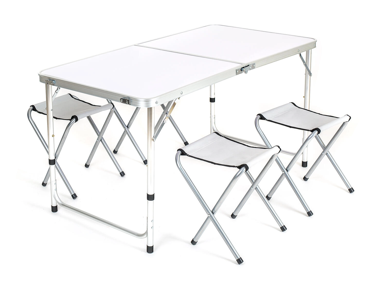 De BILBAO-set is een ideale keuze voor de camping, op reis of voor een weekendbarbecue. De aluminium tafel met afmetingen 120 × 60 cm biedt voldoende ruimte voor eten en spelletjes, terwijl vier opvouwbare stalen krukjes met een draagvermogen van 100 kg voor betrouwbaar zitcomfort zorgen. Dankzij de verstelbare telescooppoten pas je de tafelhoogte eenvoudig aan: 70 / 62 / 55 cm.