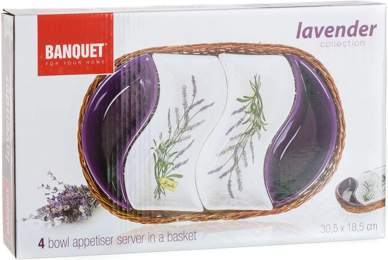 De LAVENDER kommenset brengt harmonie van kleuren en natuurlijke materialen op uw tafel. Twee kommen met een subtiel lavendeldecor en twee paarse keramische kommen zorgen voor een prachtige presentatie van hapjes, salades, dips of desserts. De rieten mand houdt alles bij elkaar, maakt het dragen gemakkelijk en geeft de set een rustieke uitstraling.