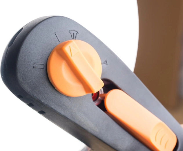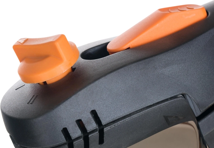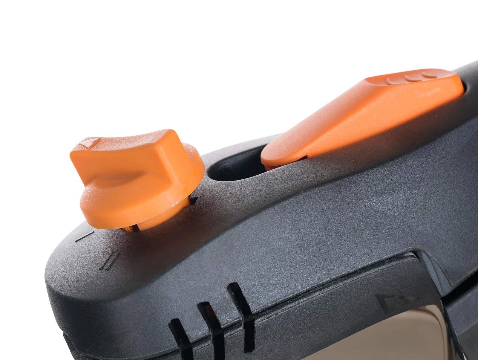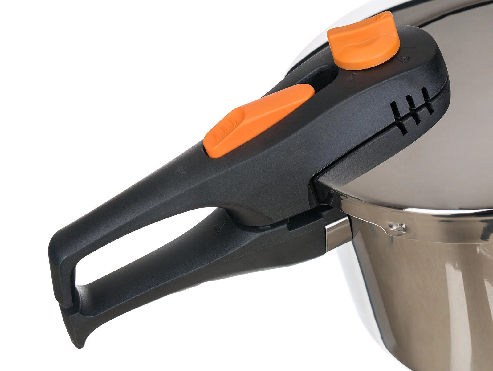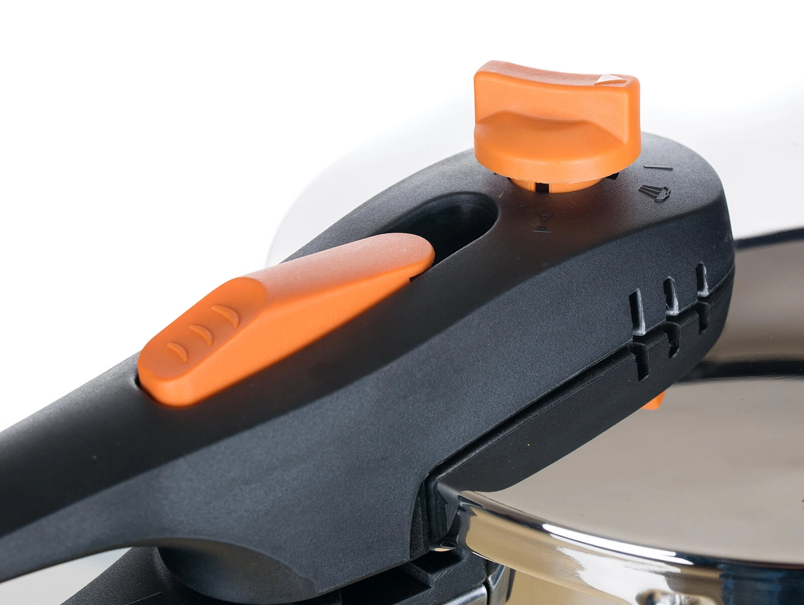 Intuïtieve drukregeling en stoomafvoer dankzij opvallende oranje elementen op het handvat voor overzichtelijke en snelle bediening.