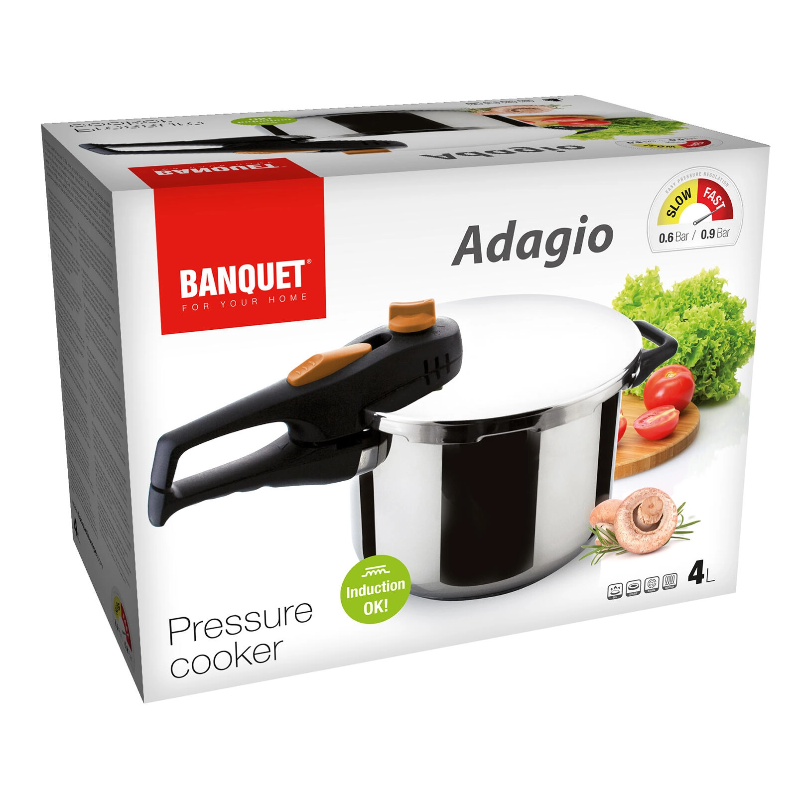 De Adagio snelkookpan 4 l is ontworpen voor dagelijks snel koken met nadruk op veiligheid en een lange levensduur. De behuizing van roestvrij staal 18/8 wordt aangevuld met een 5 mm sandwichbodem voor gelijkmatige warmteverdeling en stabiliteit op de kookplaat, inclusief inductie. De praktische bajonetsluiting zorgt voor eenvoudig en zeker vergrendelen van het deksel.