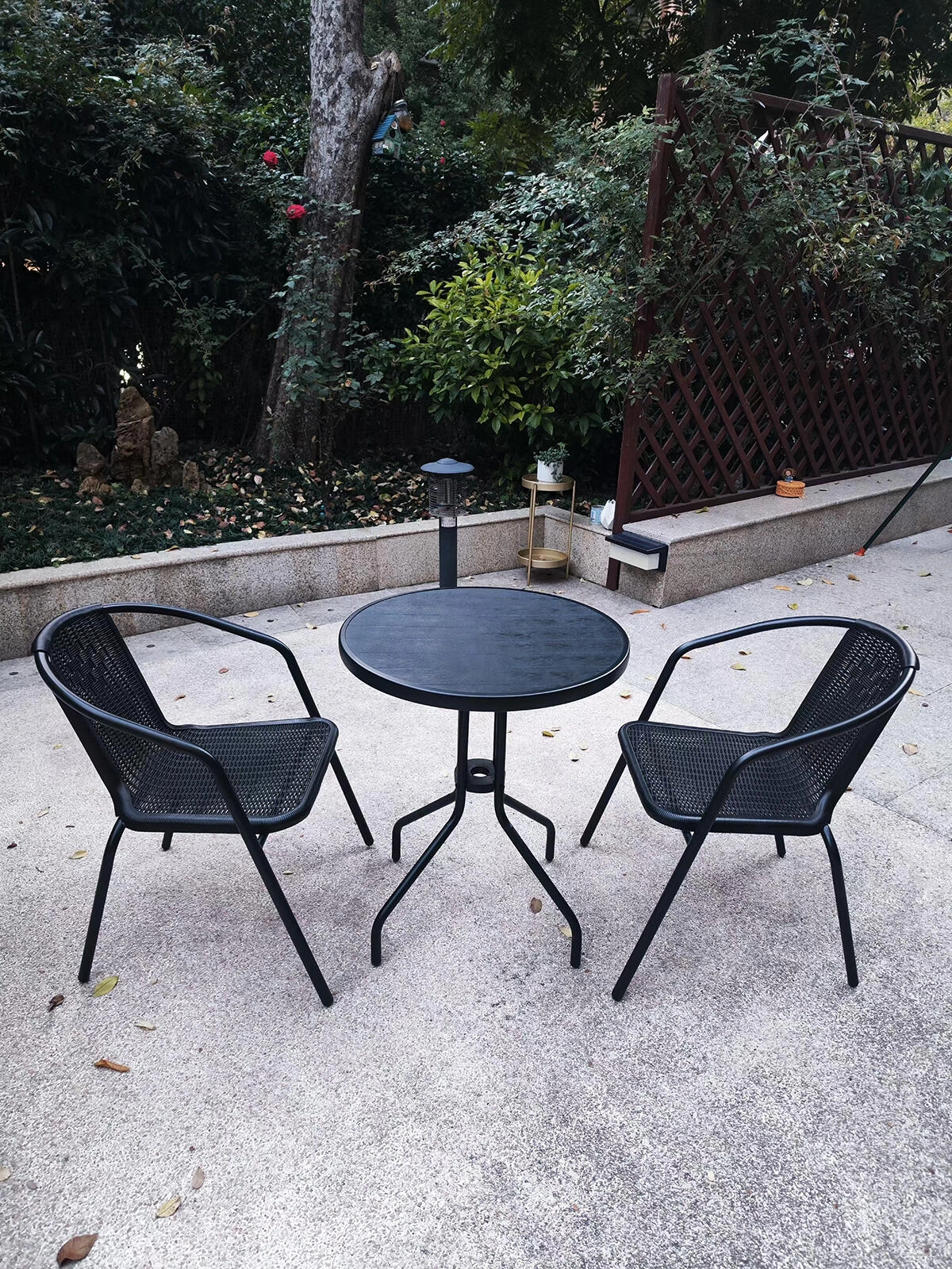 De elegante zwarte tuinset is ontworpen voor comfortabel zitten met z’n tweeën en past perfect in zowel kleine als grotere buitenruimtes. De stoelen met rotanlook van PH en het stabiele metalen frame zorgen voor een lange levensduur en eenvoudig onderhoud, terwijl de compacte ronde tafel ideaal is voor drankjes en kleine hapjes.